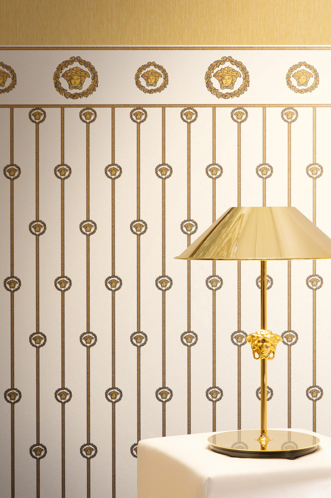 Mit ihren tiefen Goldtönen und den legendären Medusa-Motiven verströmt die Kollektion eine mystische Eleganz, die die Sinne berührt und ein Gefühl von zeitloser Erhabenheit und Glamour weckt. Jede Bahn ist ein leidenschaftliches Bekenntnis zu Extravaganz und Stil, das Ihr Zuhause in eine Bühne für Ihre eigene, glanzvolle Persönlichkeit verwandelt.