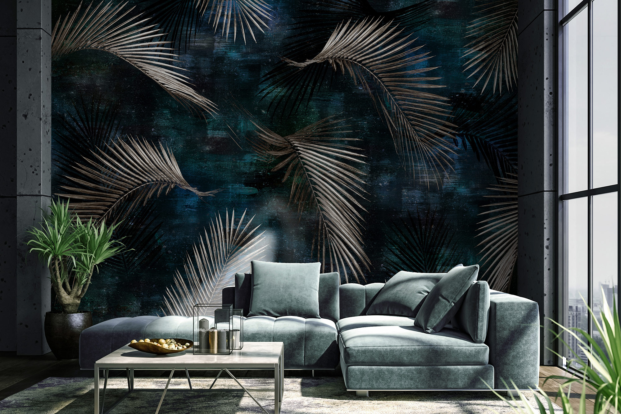 Glossy Palms - hier ist der Name Progamm. Atemberaubende Glanzeffekte stehen bei diesem Wandmotiv im Mittelpunkt. Der metallische Glanz auf den Palmblättern erzeugt spektakuläre Reflexionen und Lichtspiele. In Kombination mit dem dunklen Hintergrund findet man hier die perfekte Balance zwischen mystischer Eleganz und luxuriöser Klarheit.
