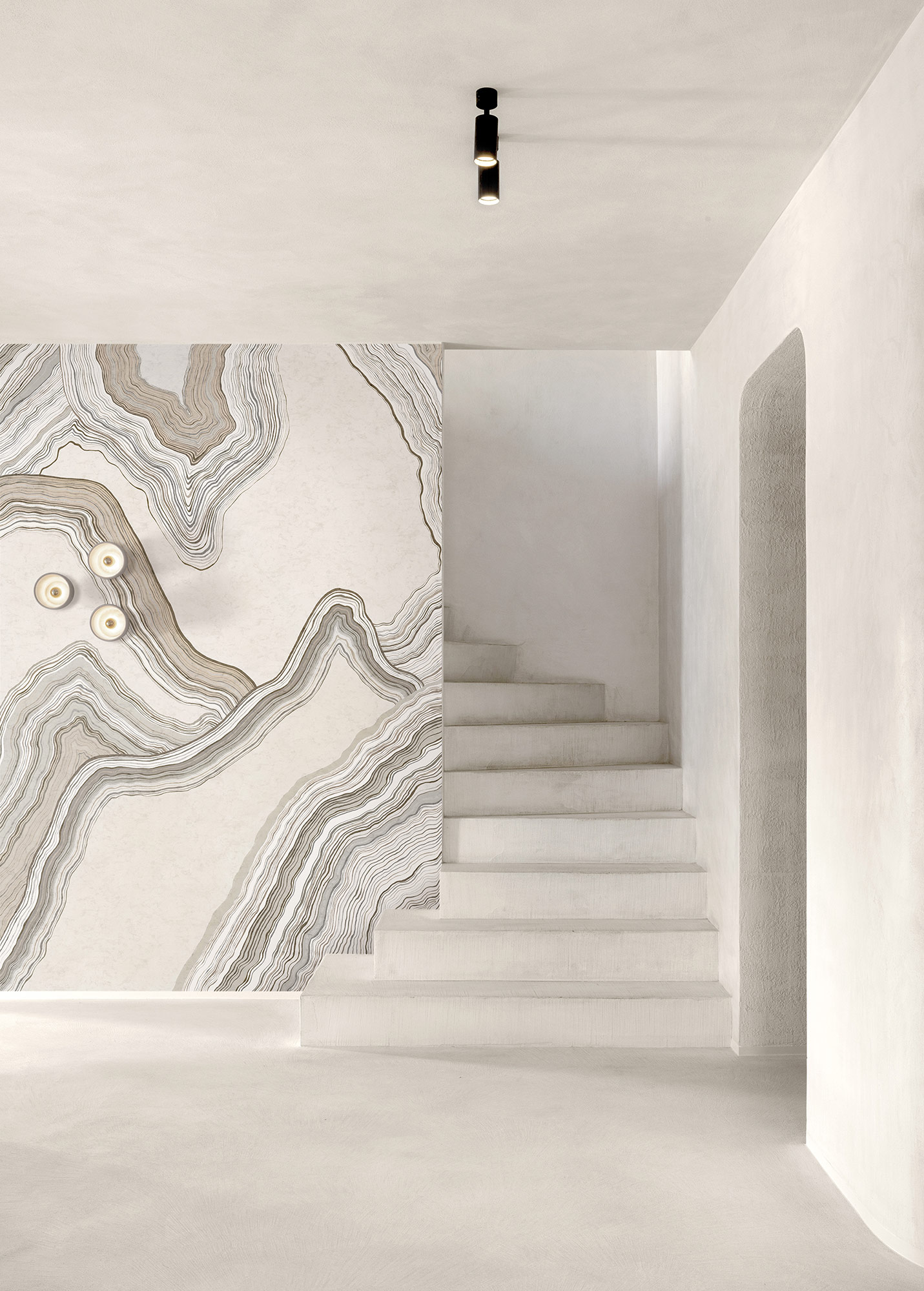 Die Kollektion Erosion von Khrôma by Masureel zelebriert die Schönheit des Unvollkommenen und thematisiert den Prozess von Vergänglichkeit und Erneuerung durch die Zeit. Die Designs zeichnen sich durch natürliche Texturen und unerwartete Muster aus, die von organischen Oberflächen wie Leinen, Sand und Stein inspiriert sind. Mit einer Farbpalette aus natürlichen Pigmenten und haptischen Strukturen verleihen diese Tapeten Räumen eine ruhige, erdige und dennoch luxuriöse Atmosphäre.