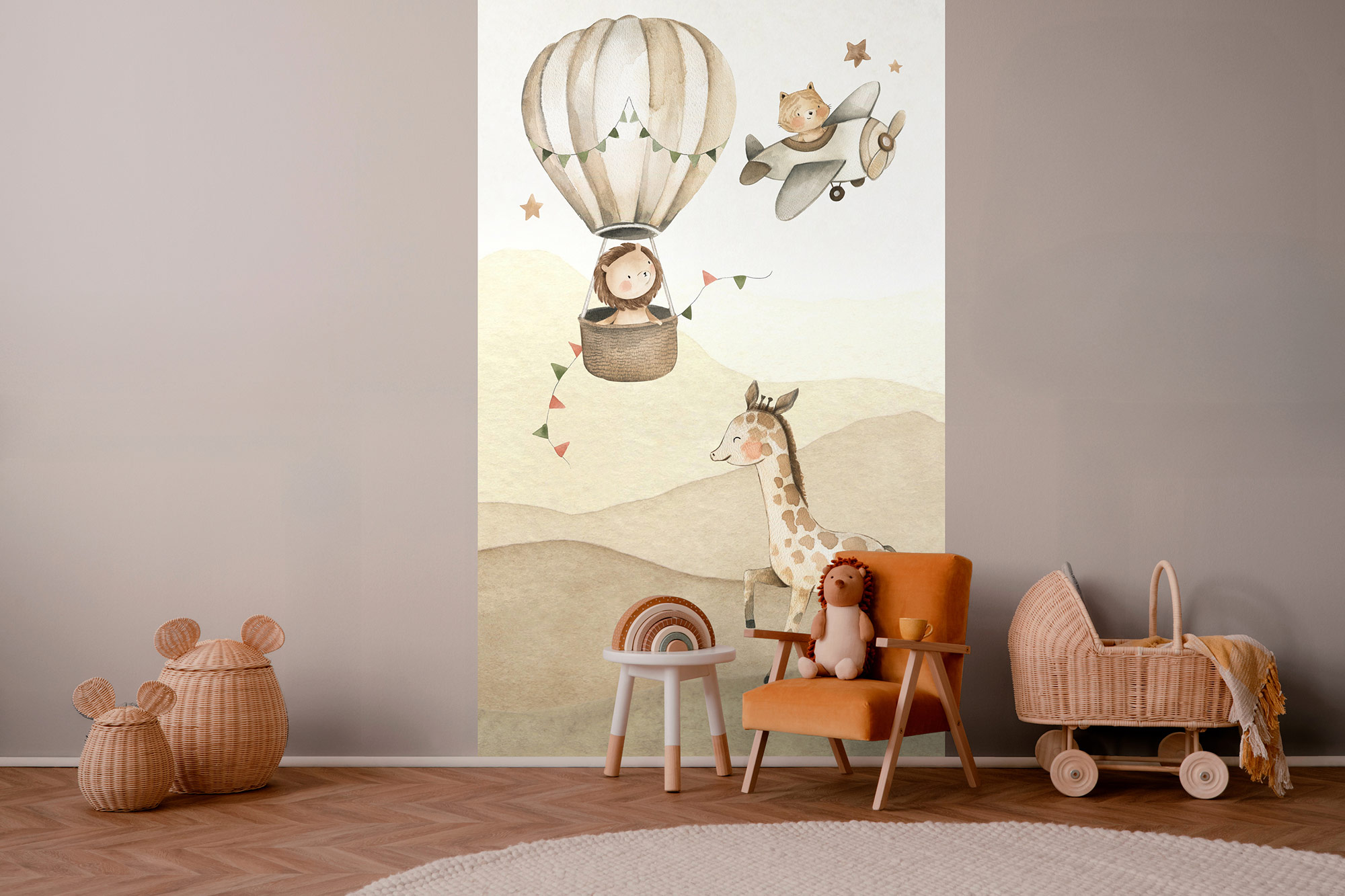 Dieses Wandbild bringt spielerische Abenteuer ins Kinderzimmer. Ein Elefant in Heißluftballons sowie ein Kätzchen im Flugzeug erkunden die Welt auf liebevolle und fantasievolle Weise. Sanfte Naturtöne und zarte Aquarell-Illustrationen schaffen eine warme und beruhigende Atmosphäre. Kleine Sterne ergänzen das Bild und laden zum Träumen und Entdecken ein. Die Tapete ist aus hochwertigem Vlies gefertigt, einfach zu tapezieren und langlebig perfekt für ein Kinderzimmer voller Abenteuerlust.