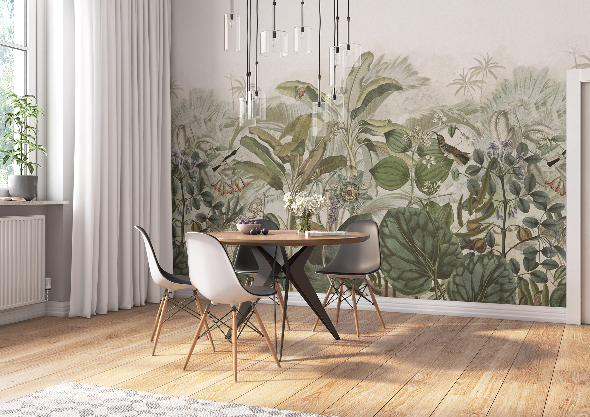 Große und kleine Blätter, exotische Blütenpracht, kuriose Vögelchen und tropische Palmen im Hintergrund unter dem hellgrünen Himmel werden zu den Hauptdarstellern. In verschiedenen Grüntönen mit vereinzelten Farbtupfern zeigen sich hier Flora und Fauna von ihrer besten Seite. Mit diesem Wandbild mit einer Große von 265 cm x 265 cm wird jede Wand zu einem Kunstwerk.