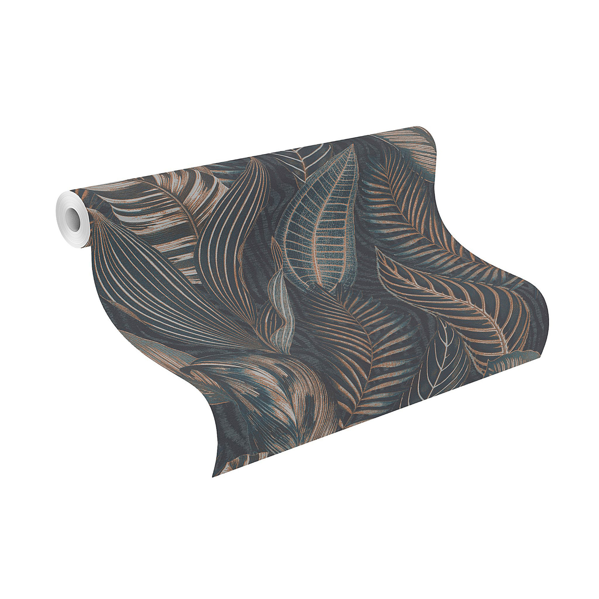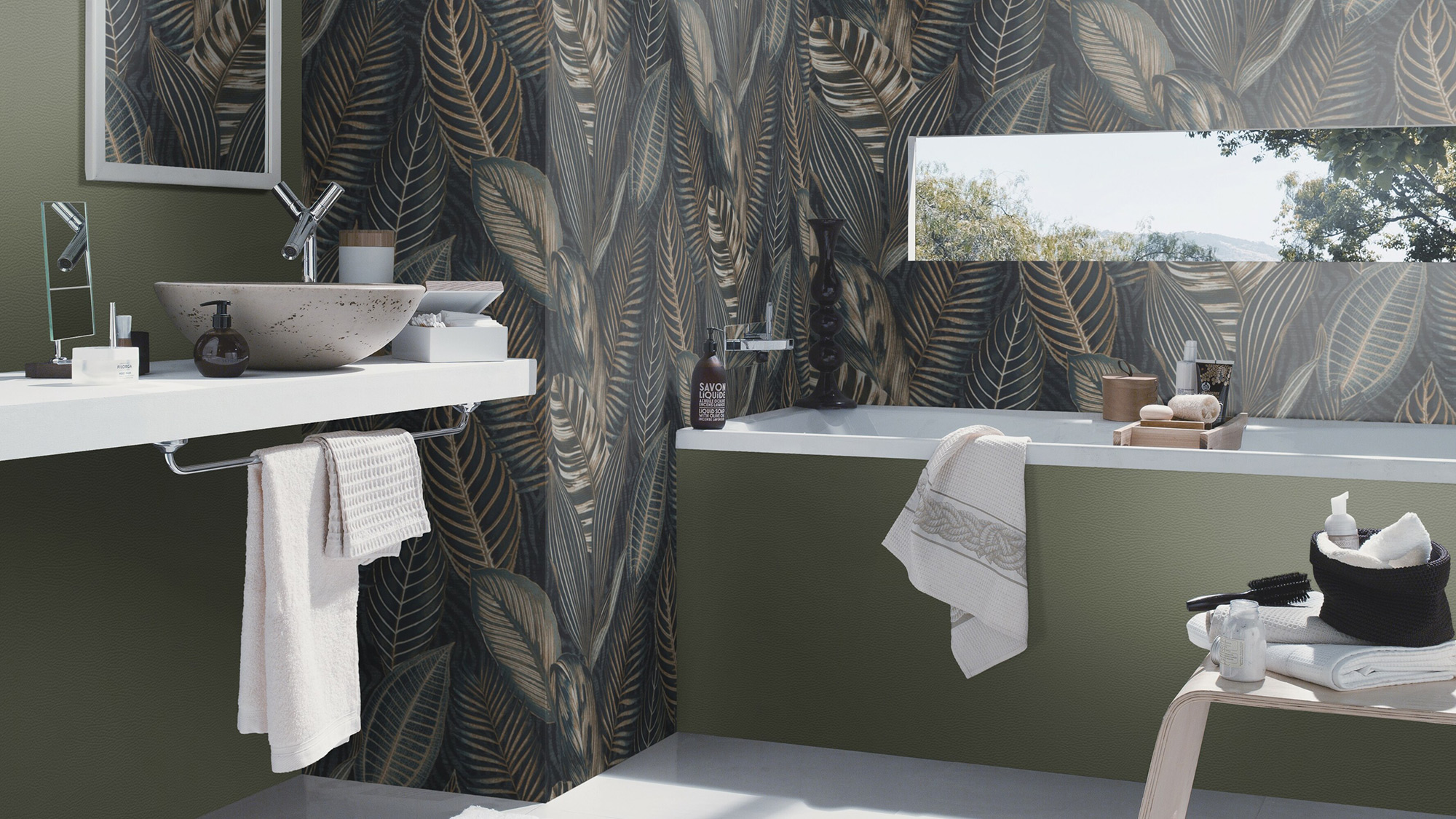 Exotische Blattmotive dürfen ab sofort auch an den Wänden wuchern. Denn hier präsentieren sich die unterschiedlichsten Blätter in Übergröße in dunklen Blautönen und Hellgrau und werden mit Highlights in glänzendem Gold zum absoluten Blickfang. Aber was ist das? Ein Meister der Tarnung versteckt sich im Dickicht. Wenn man genau hinschaut, sieht man das Fell eines Zebras durch die Pflanzen scheinen.