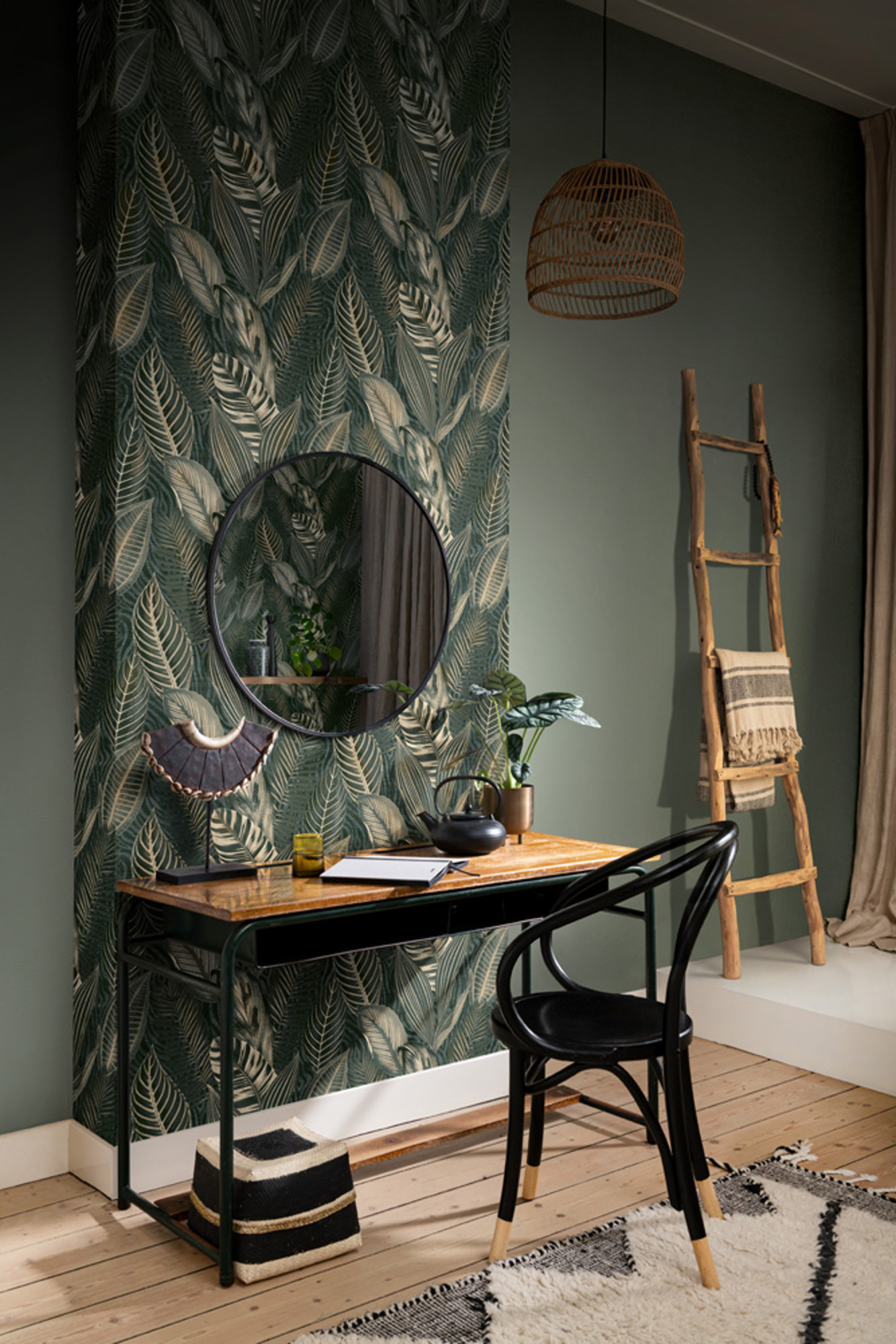 Als makelloses Imitat gibt es nun auch edles Leder für die Wand. Die fein genarbte Oberfläche in vornehmen Salbeigrün erinnert an die empfindliche Haut eines Elefanten. Durch seine besondere, aber dennoch natürliche und unaufgeregte Struktur lässt sich dieses Uni hervorragend mit den anderen Designs dieser Kollektion kombinieren.