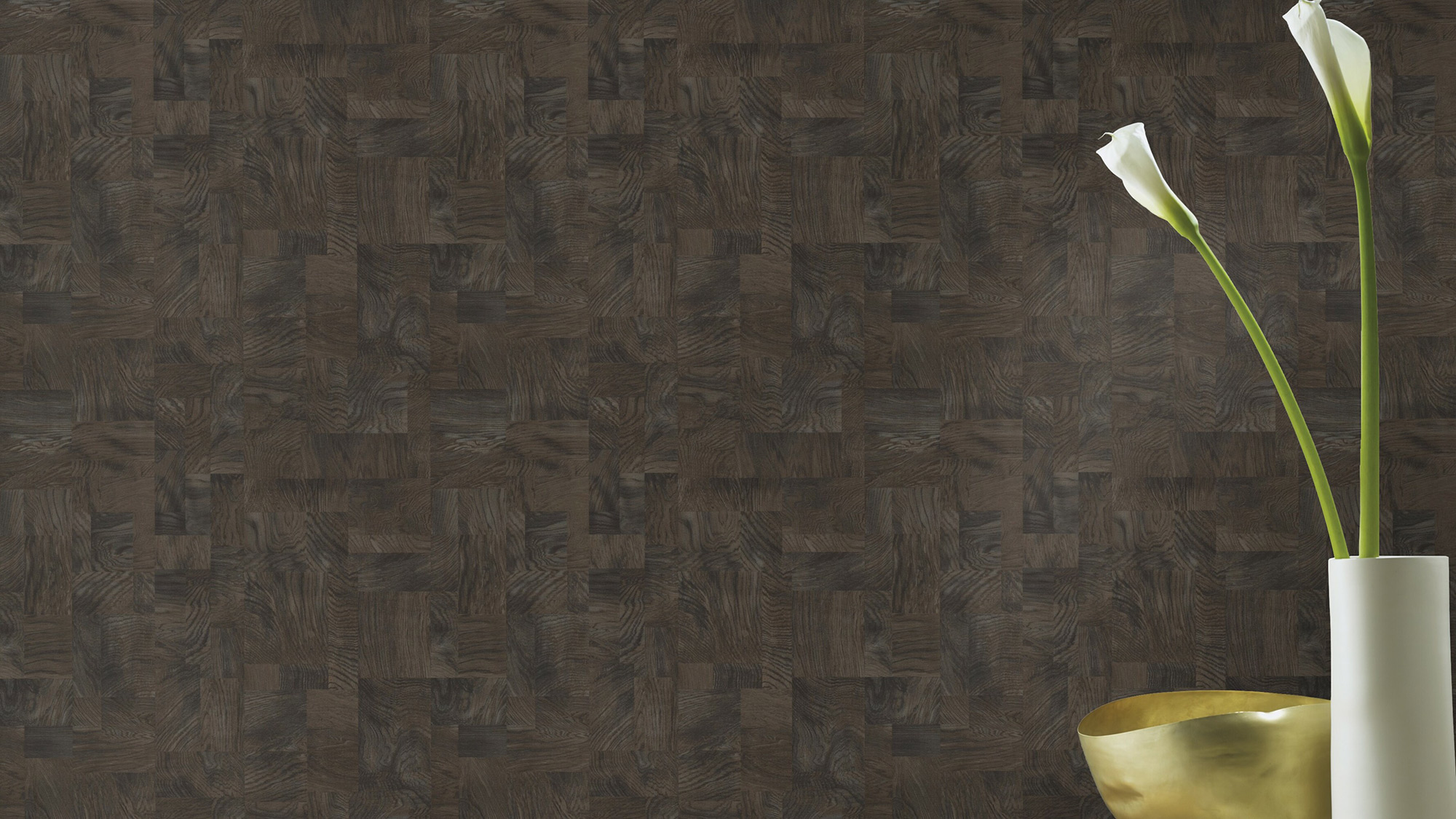 Vierecke in unterschiedlichen Größen mit einer fantastischen Holzoptik lassen ein unaufgeregtes Bild entstehen. Dank der schwarzen Maserungen spielen die dunkelbrauen Formen geschickt mit dem Auge des Betrachters. So inszeniert sich im Nu ein wundervoller und natürlicher Look für zuhause.