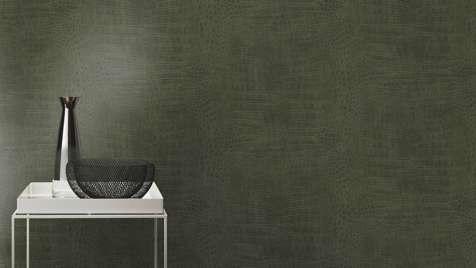 Obwohl kein Krokodil für diese atemberaubende Vliestapete in dunklem Tannengrün seinen Platz im Wasser verlassen musste, ziert von nun an ein phantastisches Krokodilleder das Zuhause. Dank einer perfekten Nachahmung des besonderen Schuppenpanzers entsteht so ein fabelhaftes Muster an der Wand und verleiht jedem Raum Eleganz, Individualität und einen Hauch Exotik.