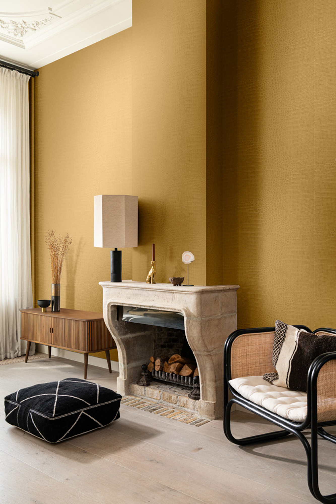 Obwohl kein Krokodil für diese atemberaubende Vliestapete in glänzendem Gold seinen Platz im Wasser verlassen musste, ziert von nun an ein phantastisches Krokodilleder das Zuhause. Dank einer perfekten Nachahmung des besonderen Schuppenpanzers entsteht so ein fabelhaftes Muster an der Wand und verleiht jedem Raum Eleganz, Individualität und einen Hauch Exotik.