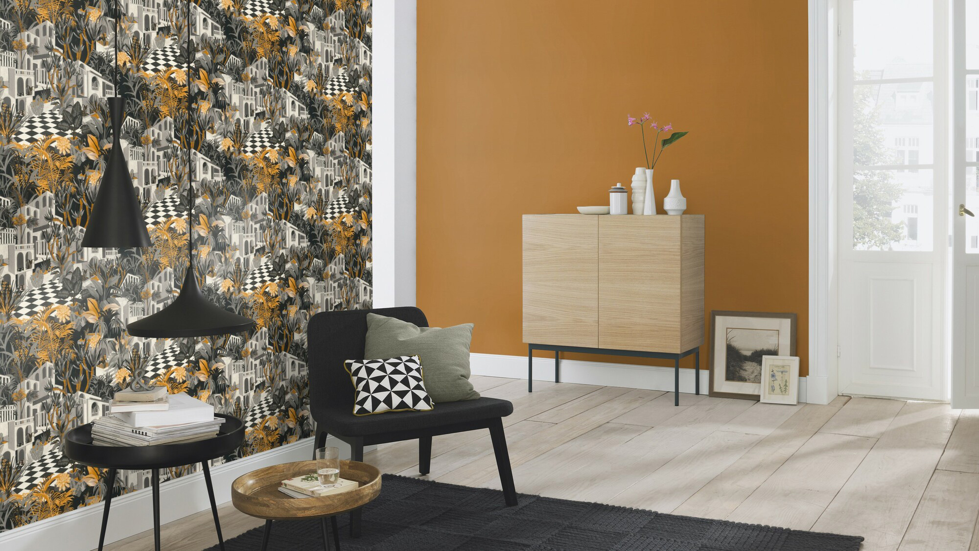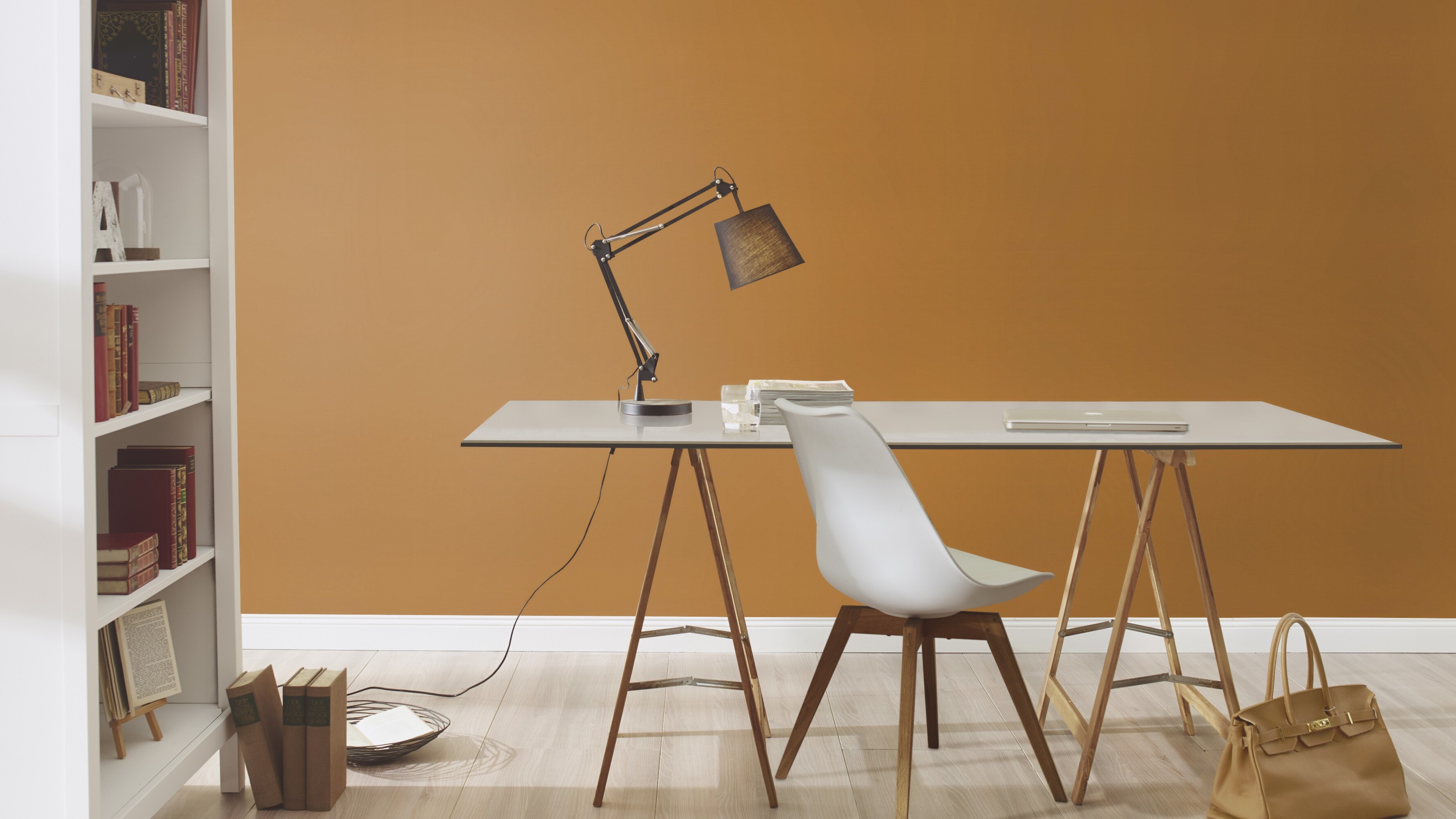 Das gehört zum guten Ton: Ein Wandlook in Karamellbraun sorgt schnell für entspannte Stimmung im Raum. Wer genau hinsieht, entdeckt die zarte Struktur, die der Unitapete einen natürlichen Charakter verleiht. Dazu passen die Mustertapeten aus der Kollektion, leuchtende Accessoires und natürliche Materialien, bunte Teppiche und samtige Kissen. Einfach kombinieren und freuen.
