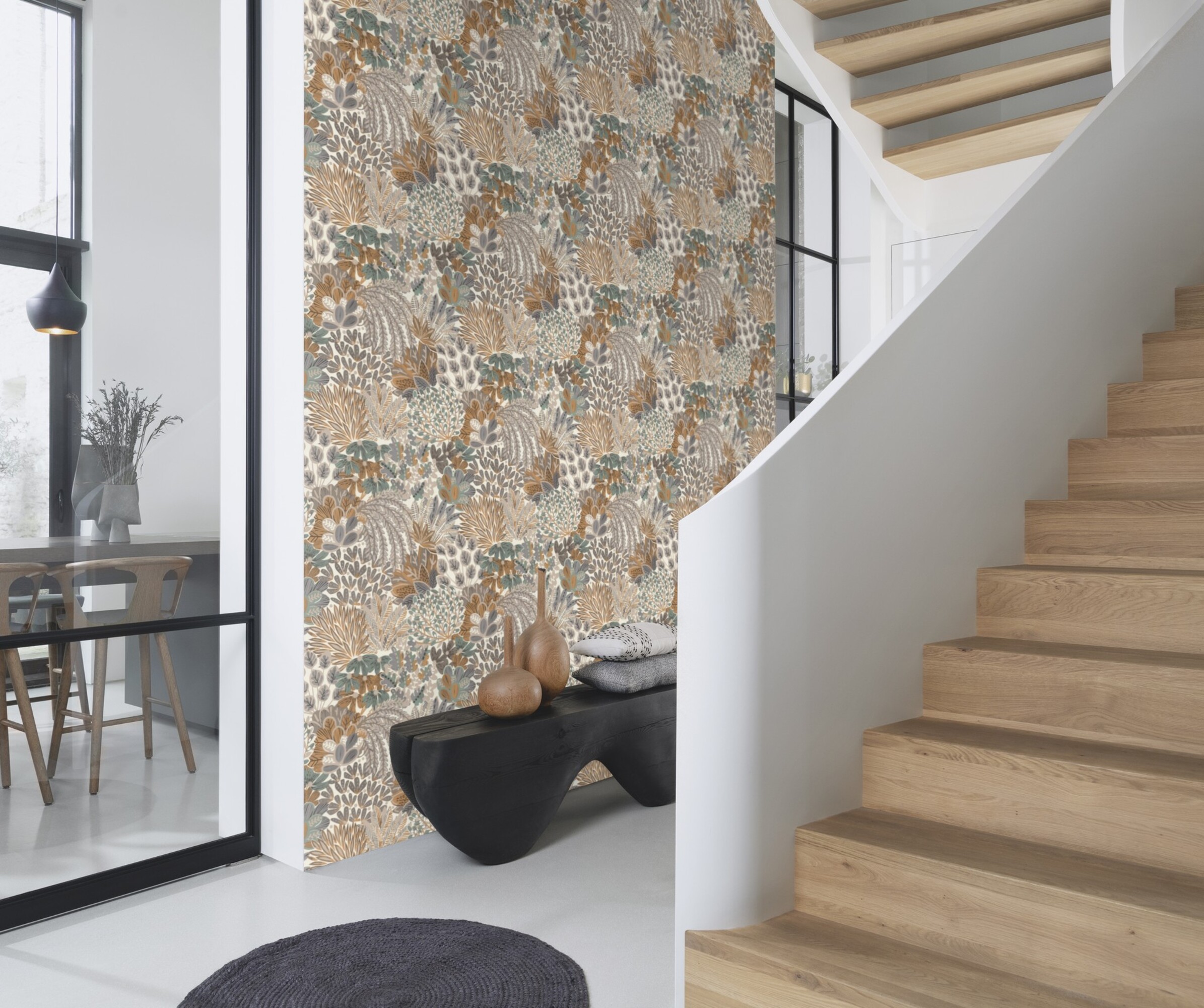 Eine einzelne Wand reicht manchmal aus, um einen Raum in ganz neuem Licht erstrahlen zu lassen. Ein üppiges, farbenfrohes Naturmotiv ist wie dafür gemacht. Ob in Salbeigrün, Kürbis, Taupe oder dunkles Beige: Hier versammeln sich Stauden, Blätter, Zweige und Blüten, um in wohltuenden Farben für eine fröhlich-entspannte Atmosphäre zu sorgen. Ein Design, das prima zum modernen Landhausstil passt, aber auch mit Möbeln im frischen, skandinavischen Look kombiniert werden kann.