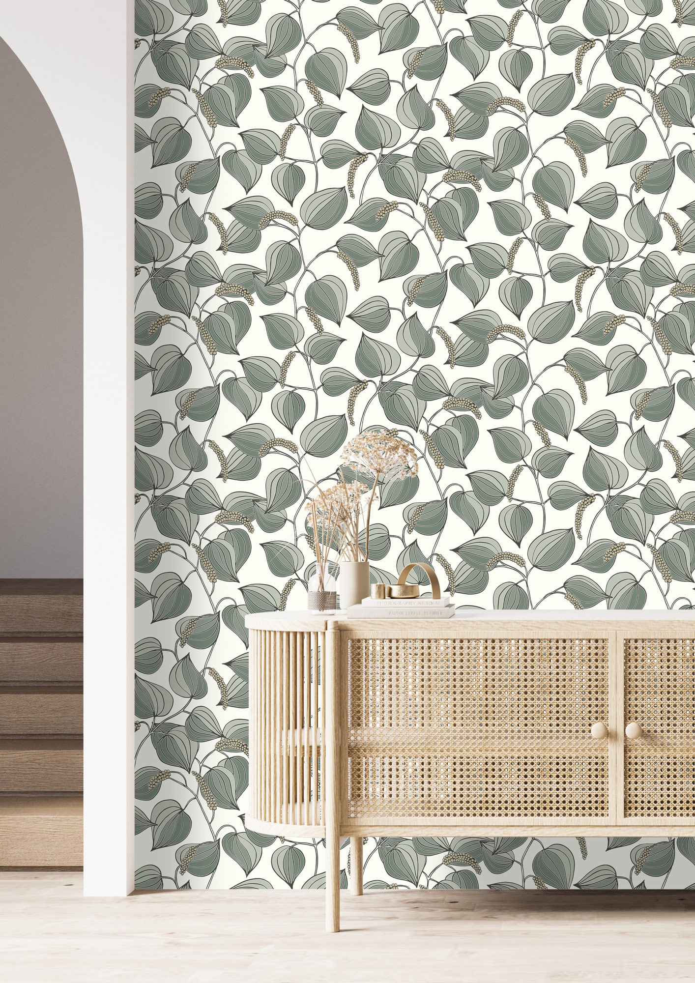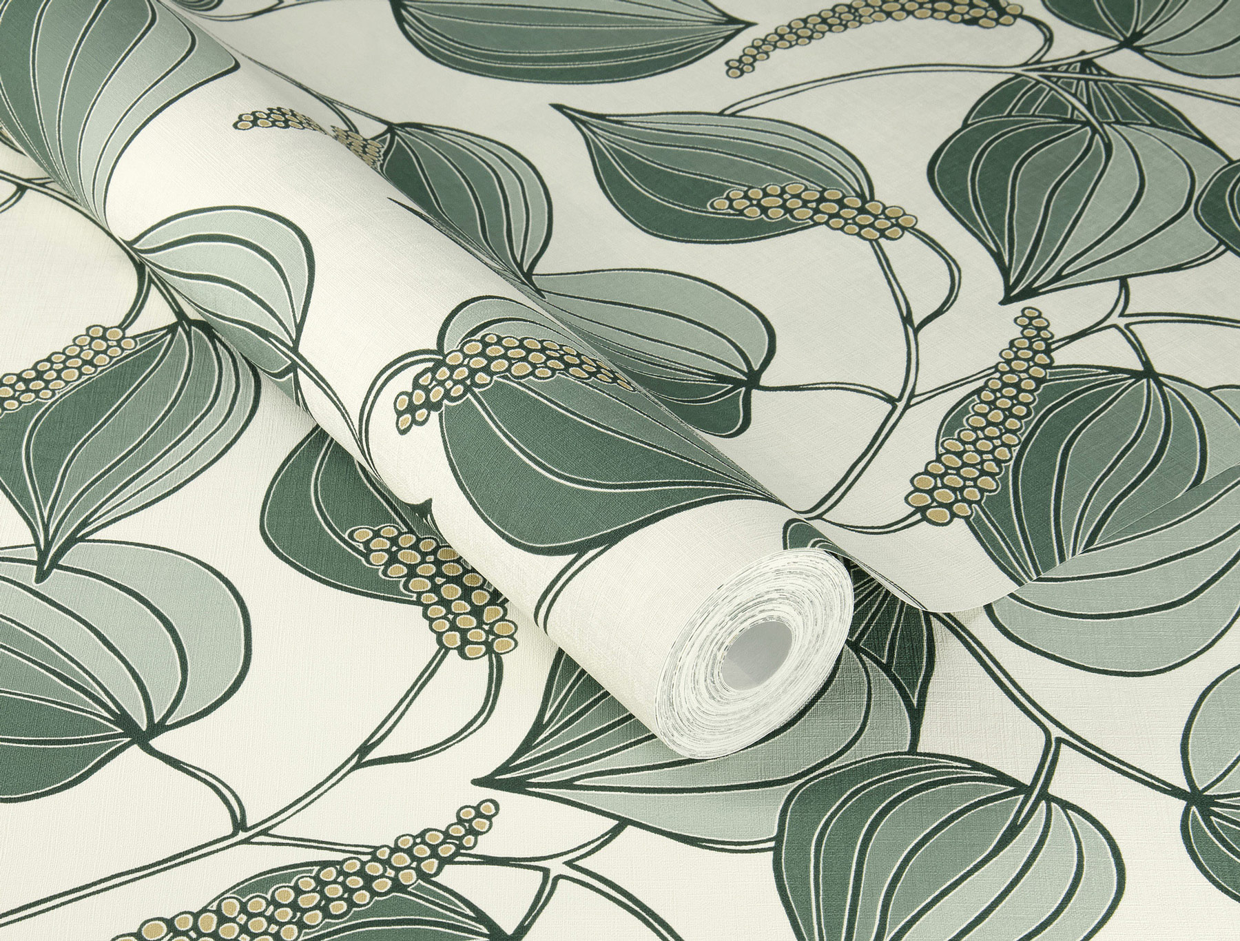Für Naturliebhaber: Ein Glück, dass die Ranken auf der Mustertapete das ganze Jahr über frisch bleiben. In drei abgestimmten Salbei-Nuancen heben sich die kugelig-konischen Blätter klar vom hellen Hintergrund ab und sorgen für eine tolle Dynamik an der Wand. Dazwischen haben sich beigefarbige Dolden platziert, die den leicht dreidimensionalen Effekt der Tapete unterstützen. Ein entspannt spannendes Design, das unser Zuhause mit Leben und Freude füllt