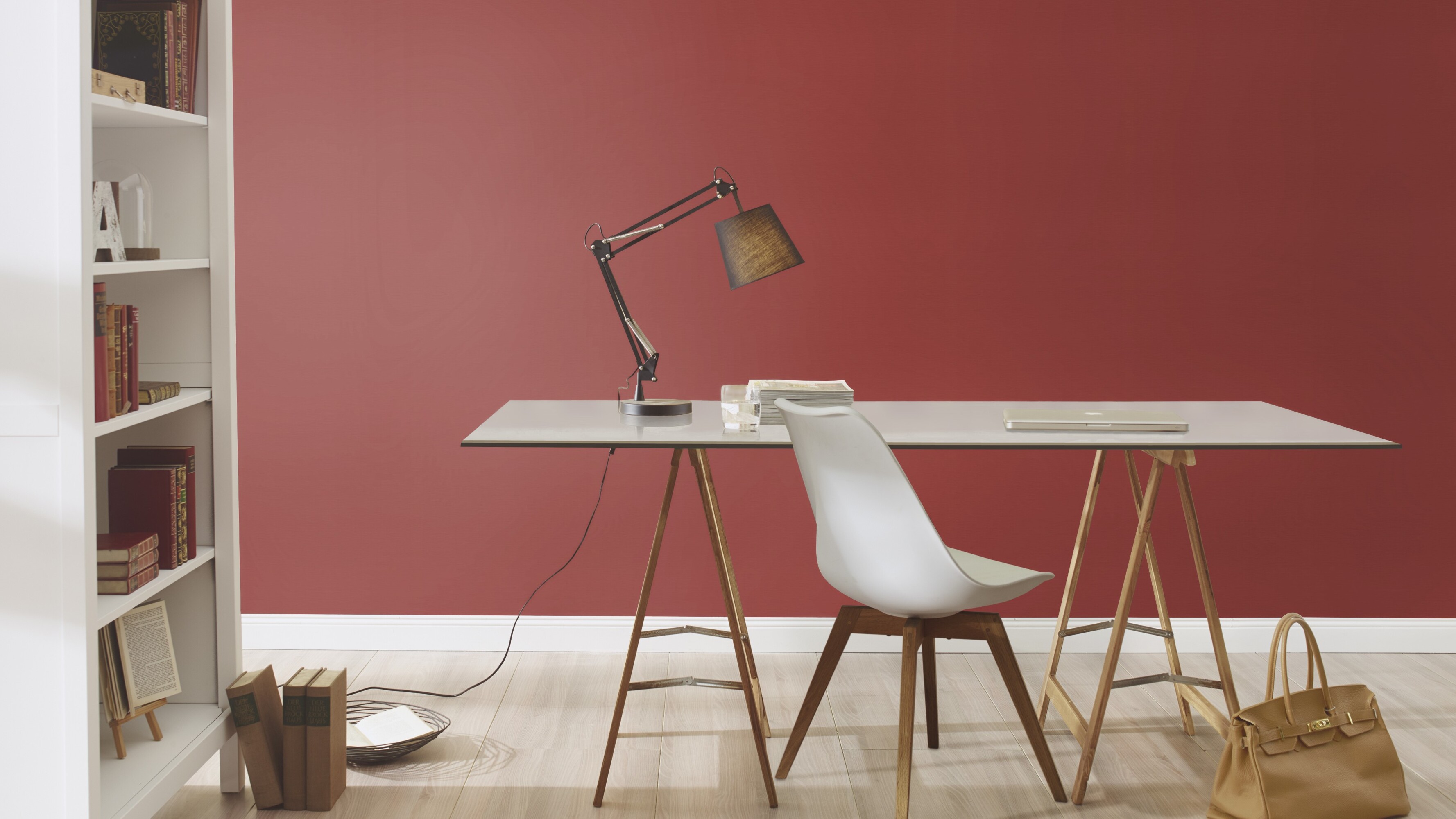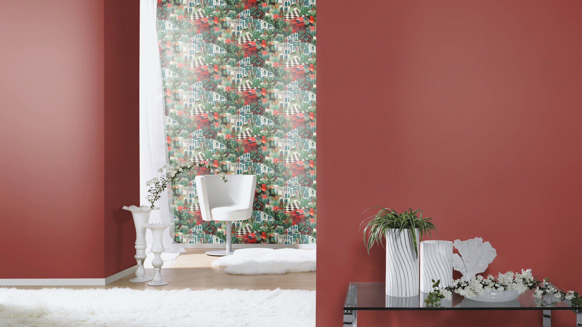 Das gehört zum guten Ton: Ein Wandlook in warmem Rot sorgt schnell für entspannte Stimmung im Raum. Wer genau hinsieht, entdeckt die zarte Struktur, die der Unitapete einen natürlichen Charakter verleiht. Dazu passen die Mustertapeten aus der Kollektion, leuchtende Accessoires und natürliche Materialien, bunte Teppiche und samtige Kissen. Einfach kombinieren und freuen.