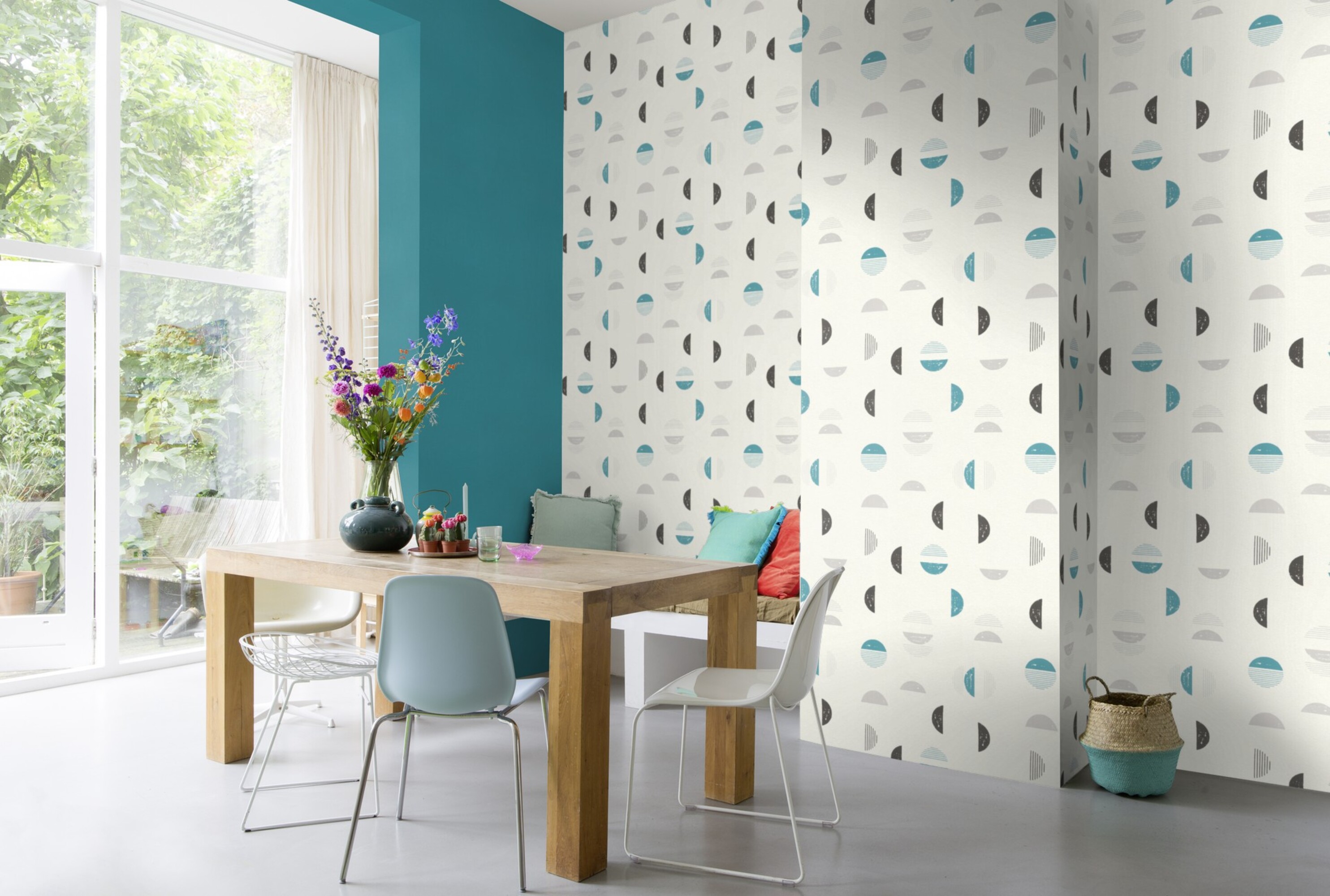 Mit einem sanften Petrol kann man einen tollen Background für Möbel und Wohnaccessoires schaffen. Durch die leichte Textilstruktur erhält die Tapete eine besondere Optik. Schön zu kombinieren mit Weiß, Holz und auch auffälligen Mustern.