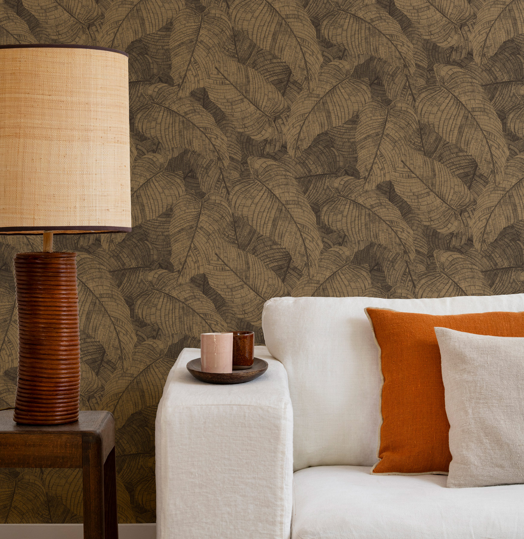 Outdoor-Feeling genießen! Und dafür muss man noch nicht einmal Schuhe anziehen, denn das Tapetenmotiv arrangiert die Natur gleich mitten im Wohnzimmer, im Flur oder hinter dem neuen Sideboard. Mit seinen großen, dekorativen Blättern schafft das Design eine beruhigende, einladende Atmosphäre. Interessant ist die dreidimensionale Optik, sodass die geprägten Blattstrukturen noch besser zur Geltung kommen können. Helles Messing, Grau-Braun und ein zarter Schimmer sorgen für einen Hauch Glamour. Den