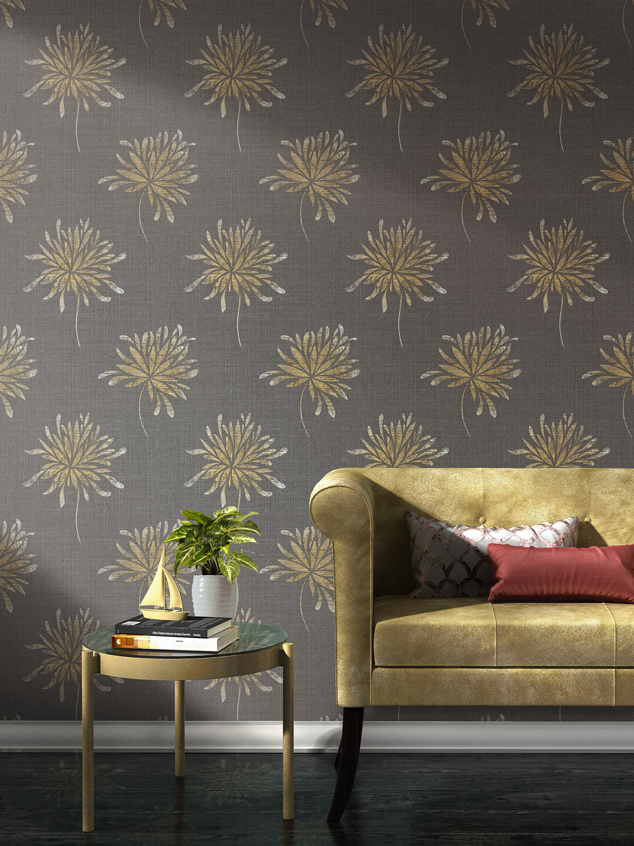 Stark! Mit wachsender Begeisterung tragen überdimensionale, abstrakte Blumen ihre in Gold und Silber gehalten Blütenblätter mit Metallic-Effekt zur Schau. Der Hintergrund in Schiefergrau und Silber mit Textilstruktur hält sich dezent zurück, macht das Gesamtbild aber perfekt.