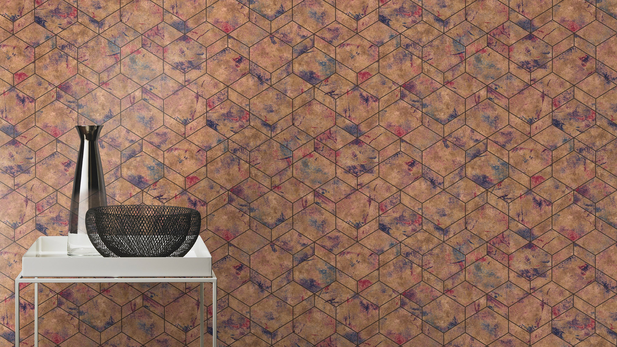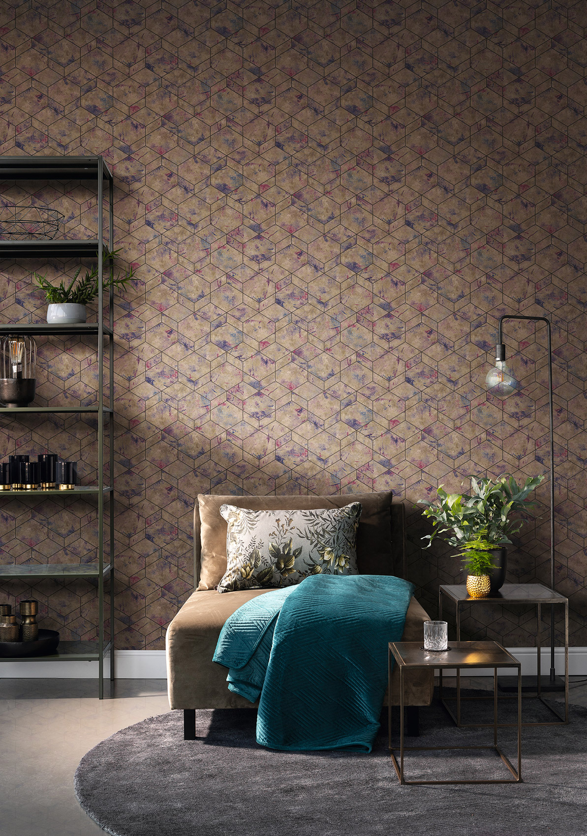 Bitte schön hier haben wir wieder mal richtig was für s Auge Dieses grafische Muster gibt dem leicht strukturierten Hintergrund den perfekten Rahmen. Metallische Effekte in Gold werden ergänzt durch Nachtblau und Purpurrot und bringen bei Lichteinfall die Wände zum Strahlen. Da lohnt sich auch immer ein zweiter Blick.