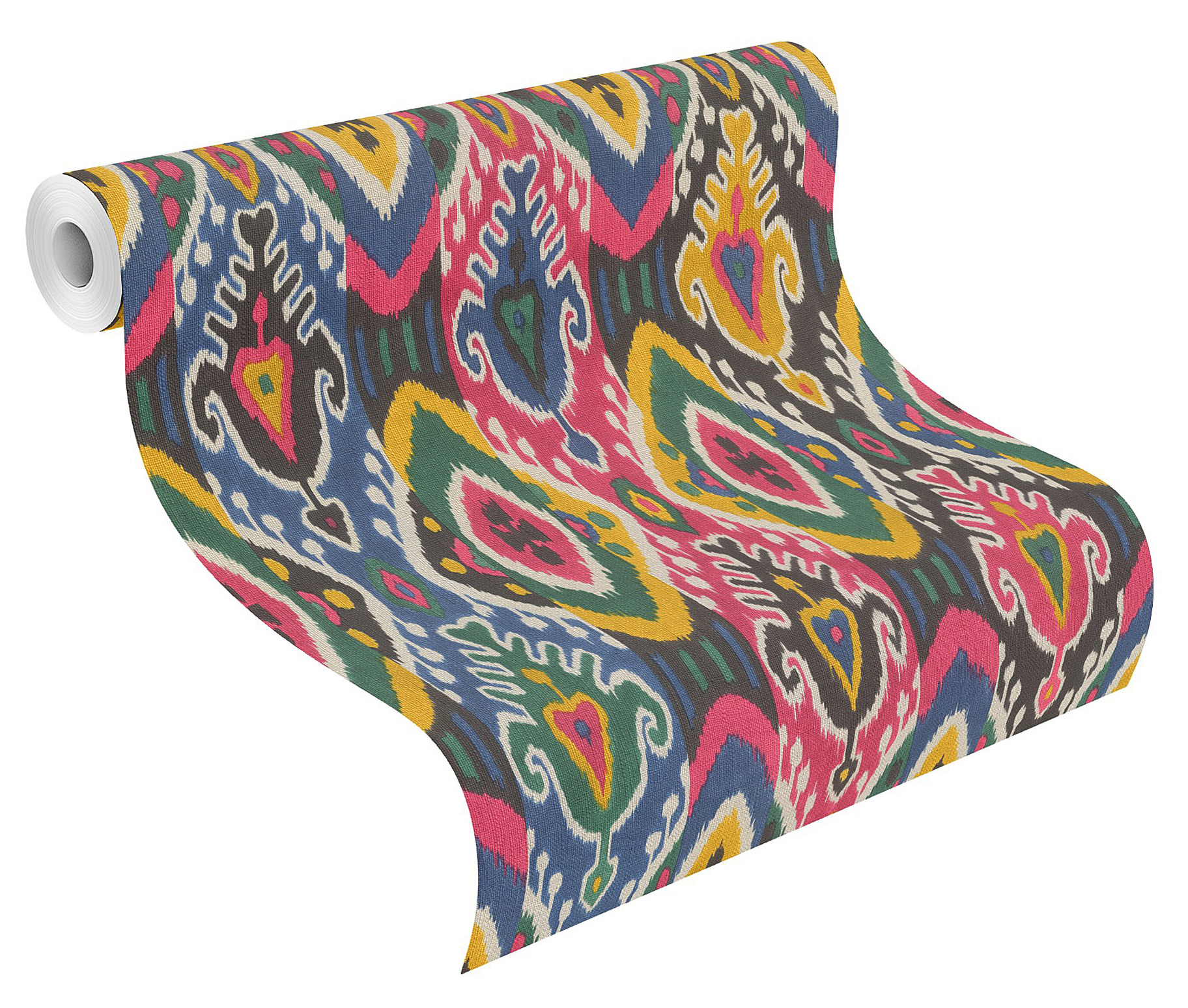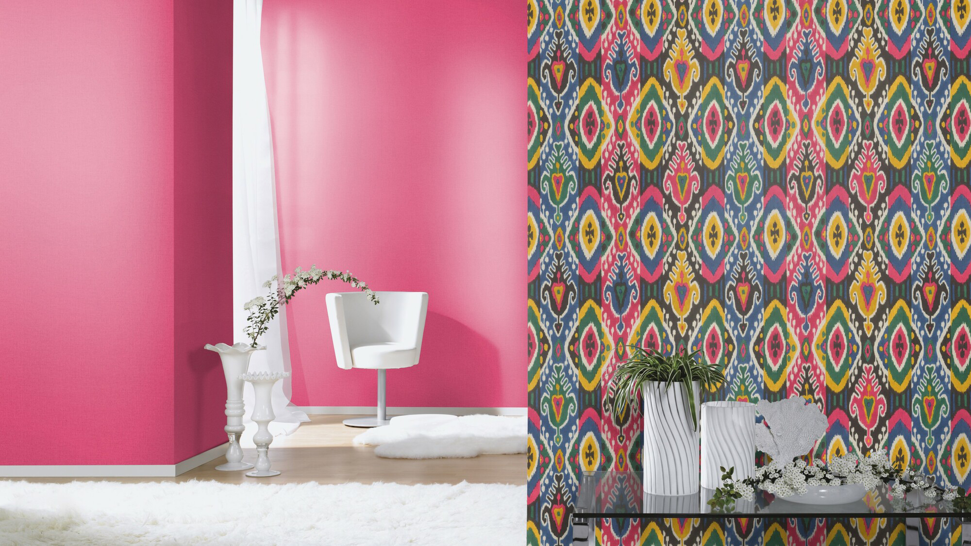 Mustergültig: Was wäre der Ethno-Trend ohne das Ikat-Muster? Gut, dass die fein gewebten Stoffe jetzt auch Wände einkleiden können. Hier in warmem Pink, Currygelb, Blau und Grün, Hellgrau mit weiß umrandeten Formen. So entsteht ein natürliches, unglaublich wohnliches Design, das wie gemacht ist, um das Leben mit Schönheit und Freude einzurichten