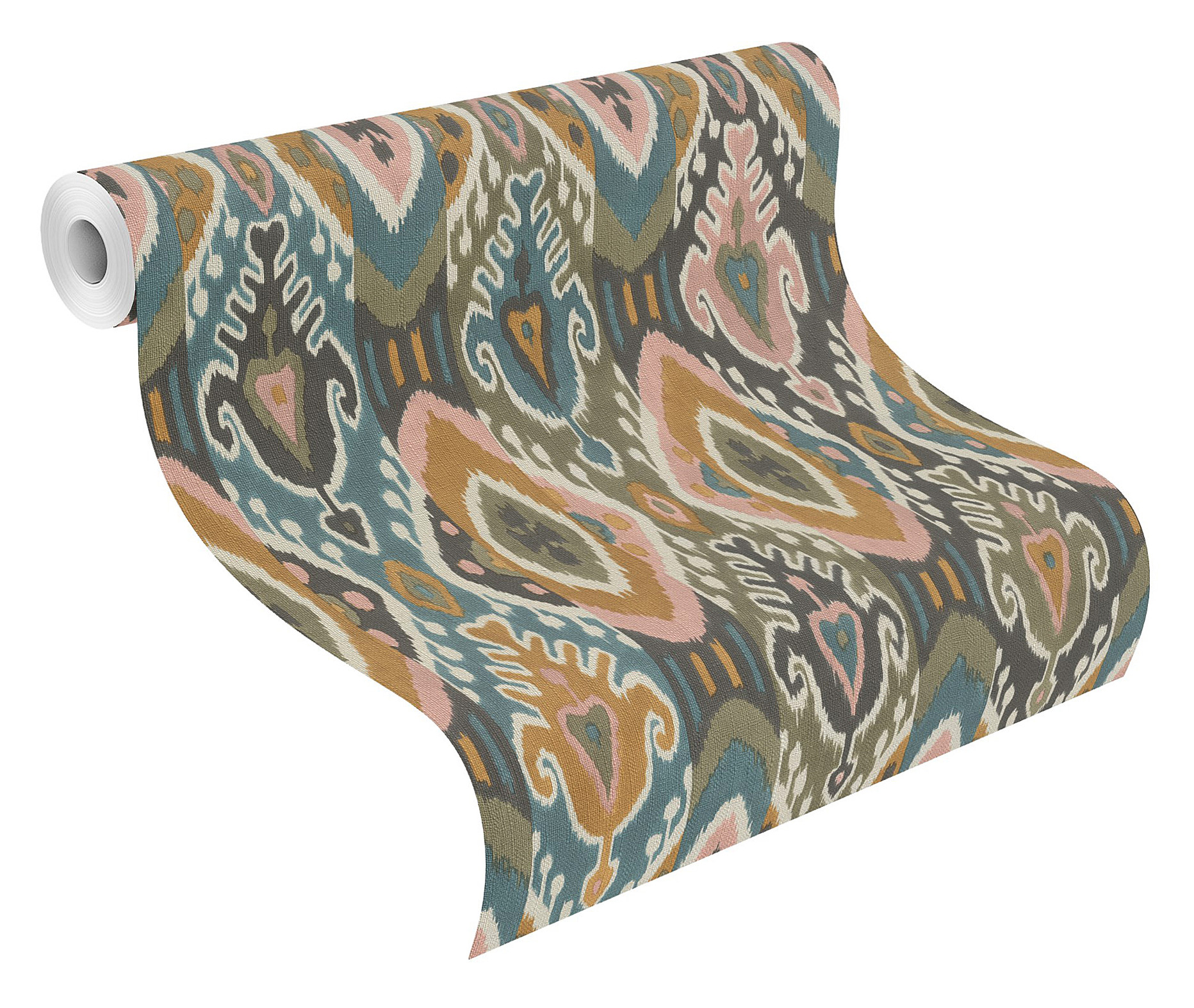 Mustergültig: Was wäre der Ethno-Trend ohne das Ikat-Muster? Gut, dass die fein gewebten Stoffe jetzt auch Wände einkleiden können. Hier in warmem Cognac, Beige, Khaki-Grün, Rosa und Petrol-Blau mit weiß umrandeten Formen. So entsteht ein natürliches, unglaublich wohnliches Design, das wie gemacht ist, um das Leben mit Schönheit und Freude einzurichten.
