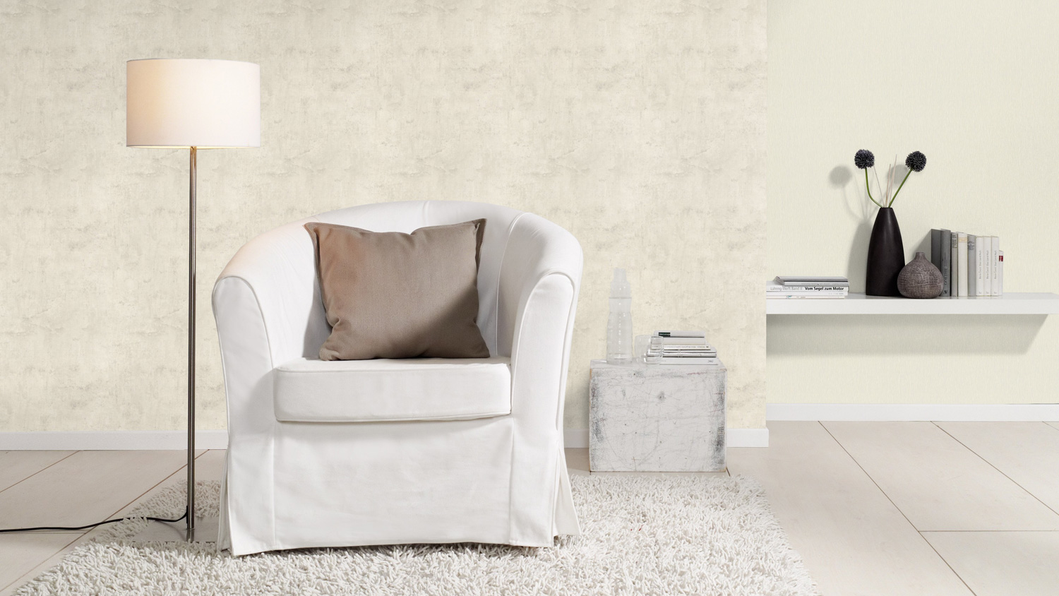 Die Optik von unverputzten Wänden ist vor allem für den Industrie-Chic eine wunderbare Einrichtungsbasis. Wenn die echten "nackten" Wände nicht dekorativ ausfallen, ist diese Betonoptik perfekt. Ihre Verläufe sorgen für eine Lebhaftigkeit, die sich nicht in den Vordergrund drängt. Und der helle Creme-Ton, der ins warme Grau geht, passt harmonisiert hervorragend mit warmen Farbtönen und Holz. Doch das Besondere ist die Haptik: Wer mit der Hand über die Tapete streicht spürt direkt naturgetreue Unebenheiten.