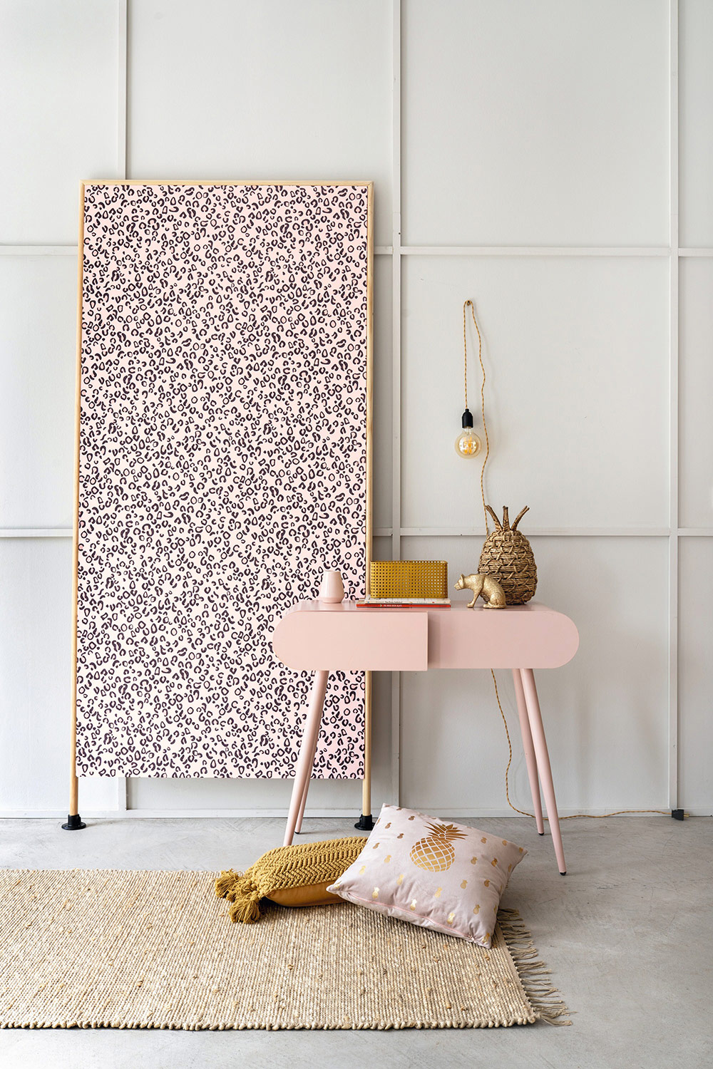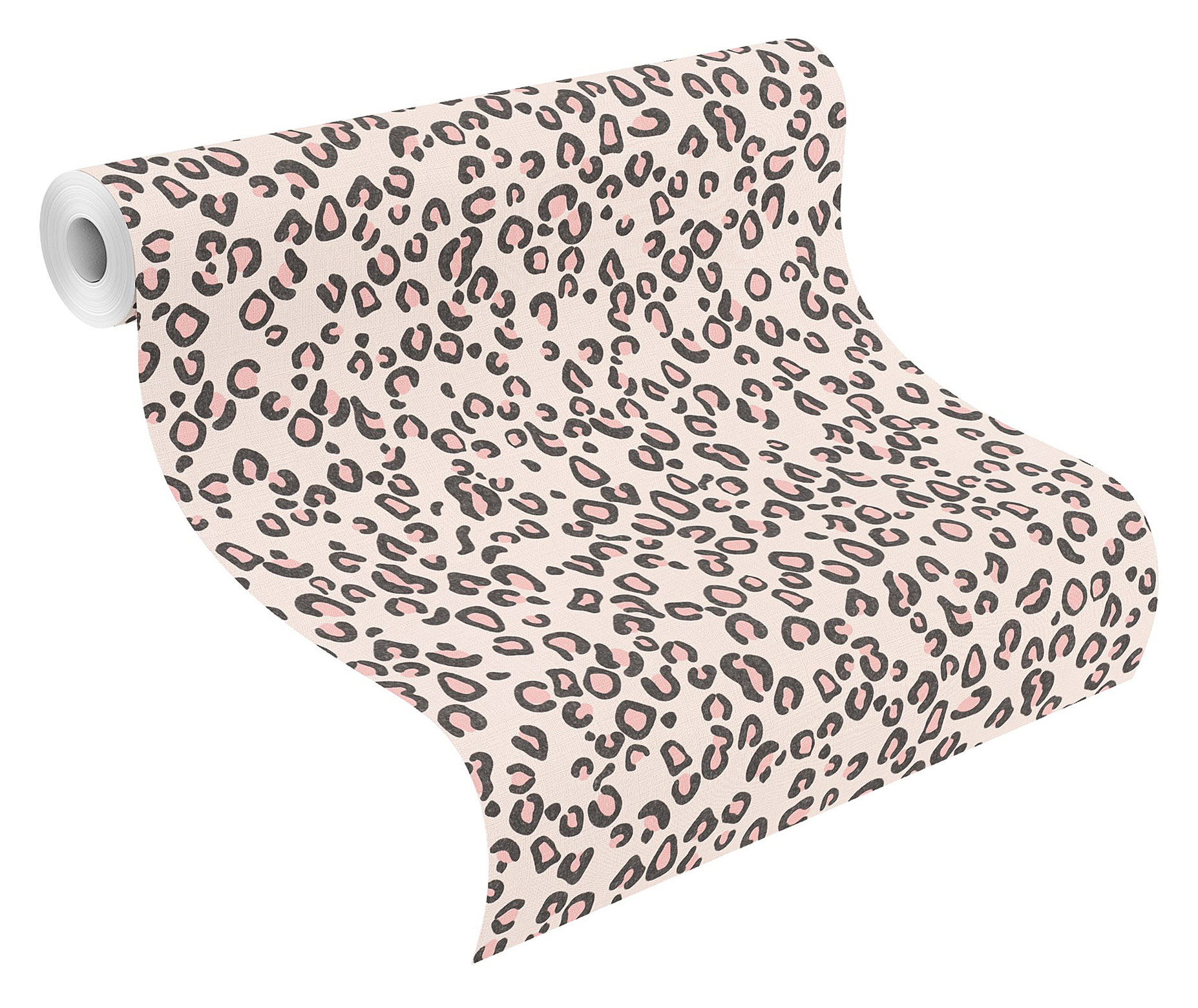 Der Leoprint ist ein Klassiker, den auch wir immer wieder gerne neu auflegen. Hier zeigt er sich von seiner grafisch-abstrakten Seite in hellem Rosé-Rot und Anthrazit. Im Hintergrund befindet sich eine pastell-rosa Textilstruktur, die für einen frischen Look an der Wand sorgt.