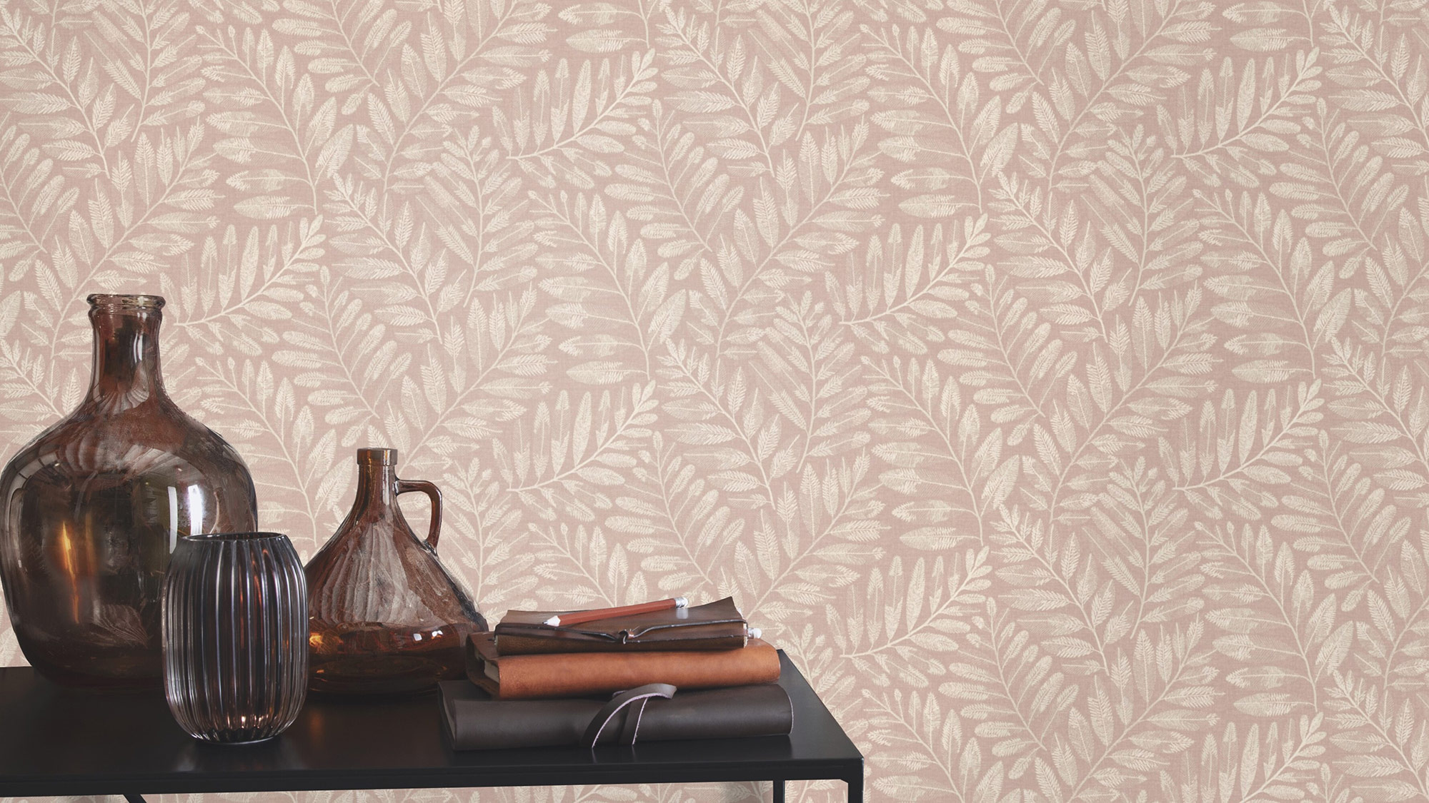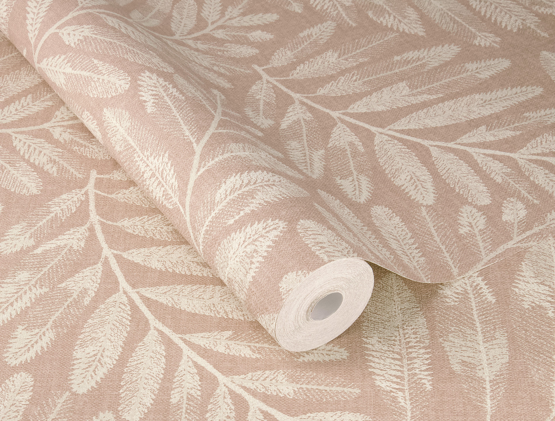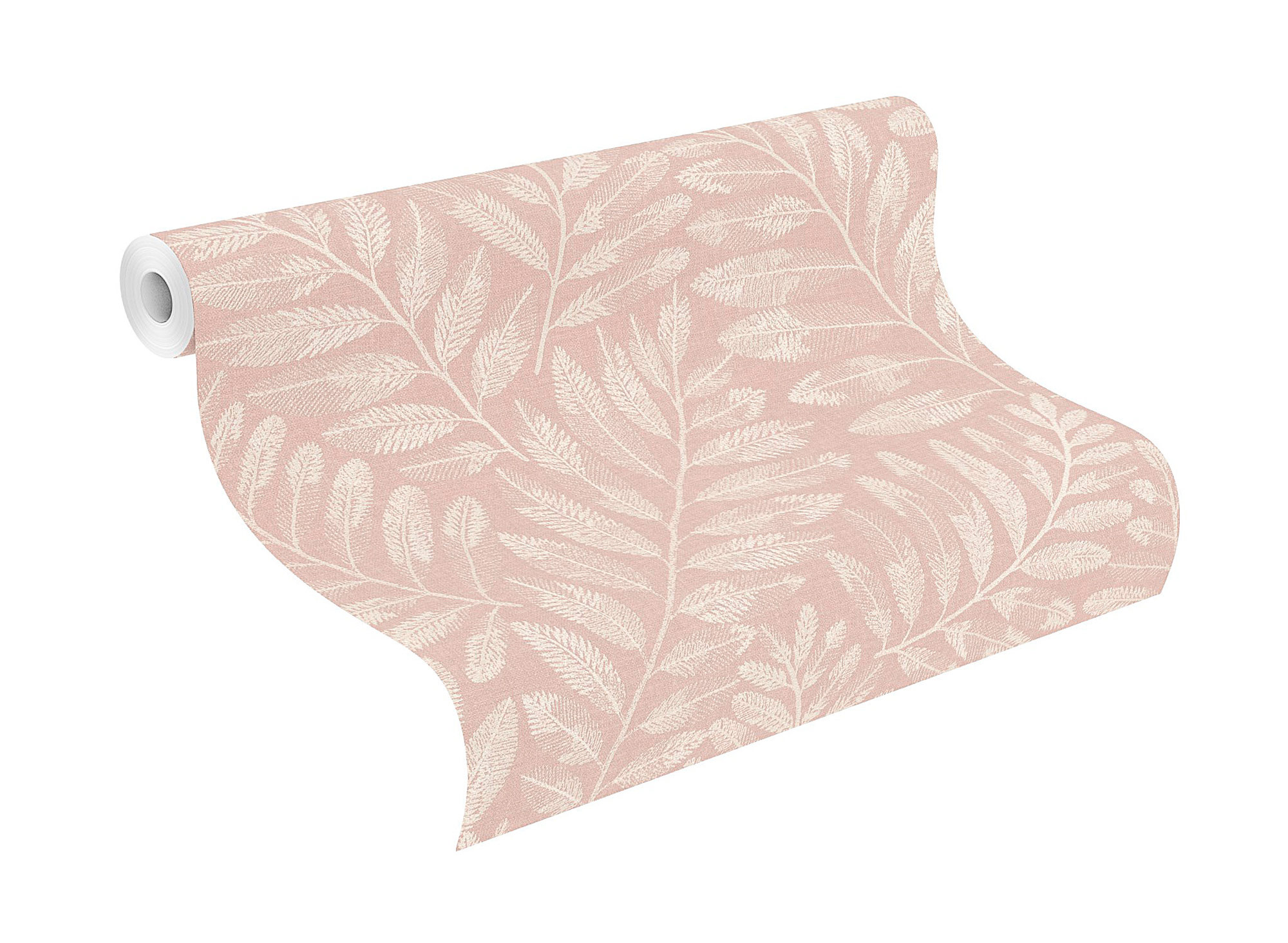 Ein zartes Blattmuster in eleganter Cremefarbe entfaltet sich auf einem sanft roséfarbenen Hintergrund und schafft eine harmonische, natürliche Atmosphäre. Die feine Struktur der Blätter wirkt detailreich und filigran, wodurch ein edler und gleichzeitig wohnlicher Charakter entsteht. Hochwertiges Vliesmaterial gewährleistet eine unkomplizierte Anbringung sowie eine stilvolle Oberfläche.