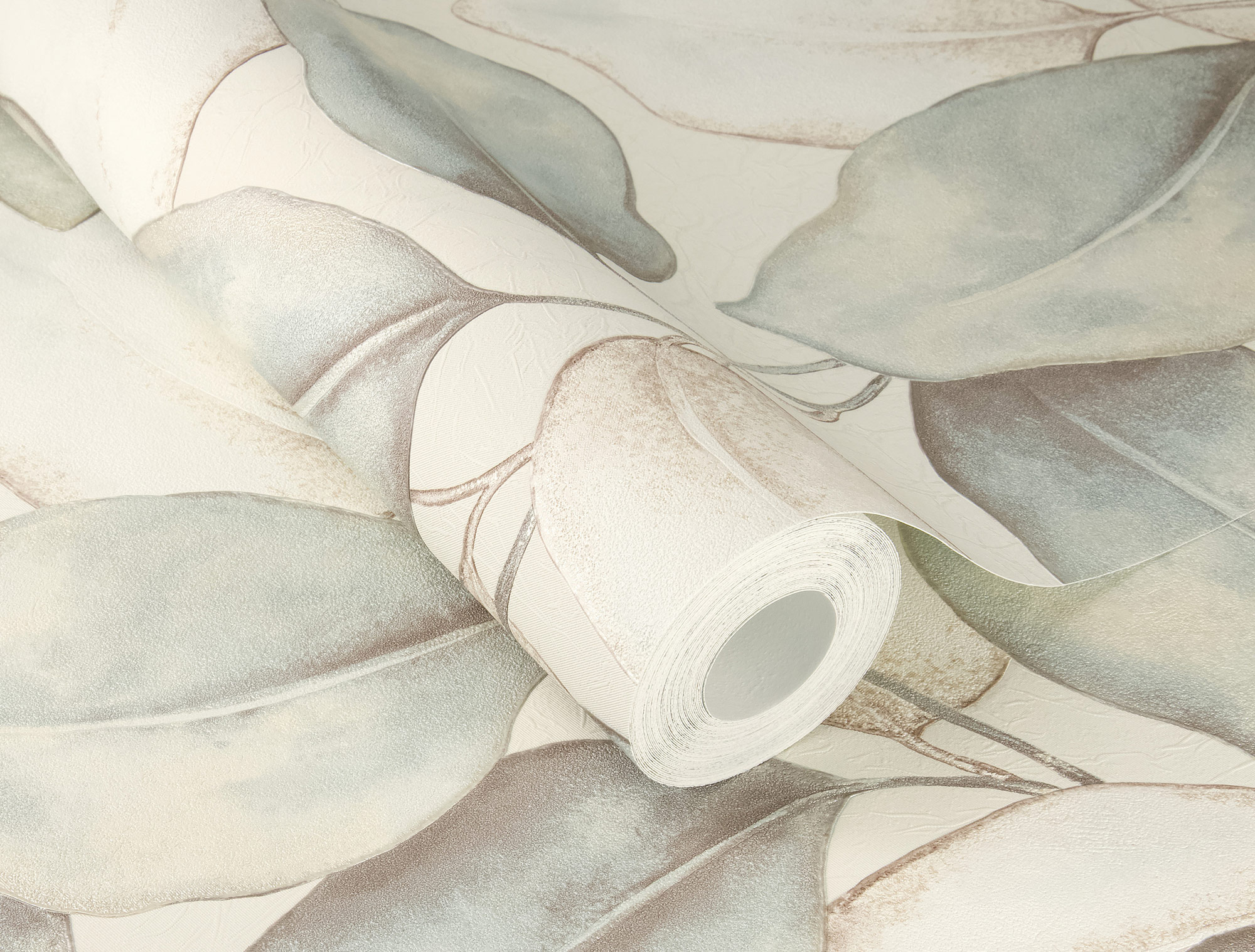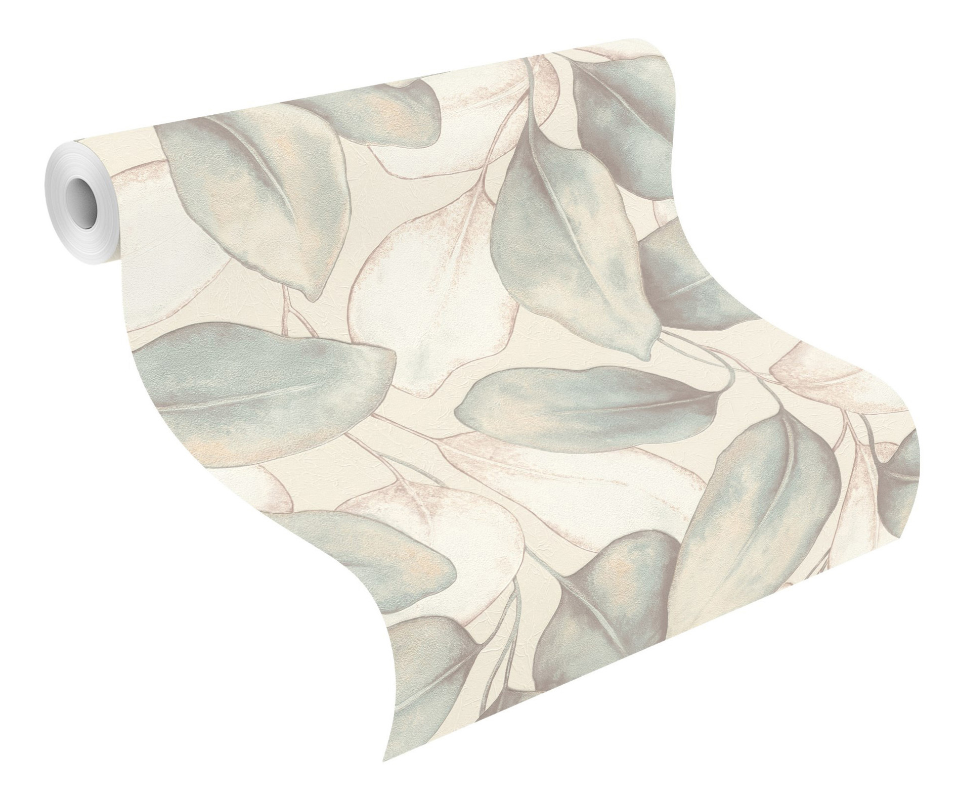 Natürlicher Glow: Wenn die ersten Sonnenstrahlen durch die Blätter scheinen, erwacht die Welt zu neuem Leben. Diesen Moment können wir jetzt jeden Tag genießen ? sei es im Wohnzimmer, im Flur oder von der Bettkante aus. Pastell-Orange und metallic-mint und schimmern die Blattoberflächen und tauchen die Wand in ein ganz neues Licht. Das wirkt natürlich, warm und edel zugleich. Grün-changierende Effekte und ein helles Taupe im Hintergrund bilden ein harmonisches Zusammenspiel, das sich sehen lasse
