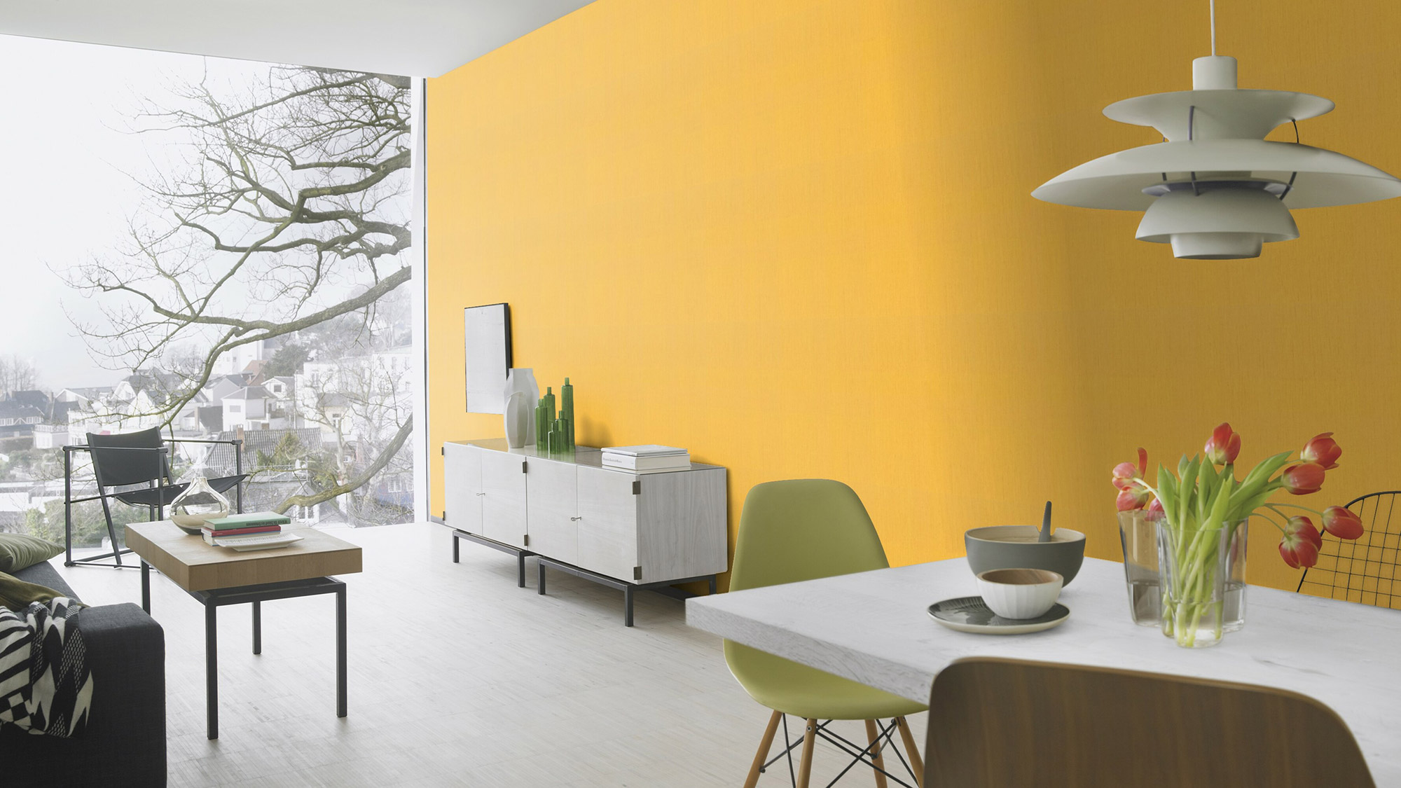 Durch ihre natürliche, textile Struktur sorgt diese Unitapete garantiert für ein angenehmes Wohngefühl. Ein fröhliches Sonnengelb verleiht dabei willkommene Vitalität und lässt sich fantastisch mit eindrucksstarken Mustern und Farben kombinieren.