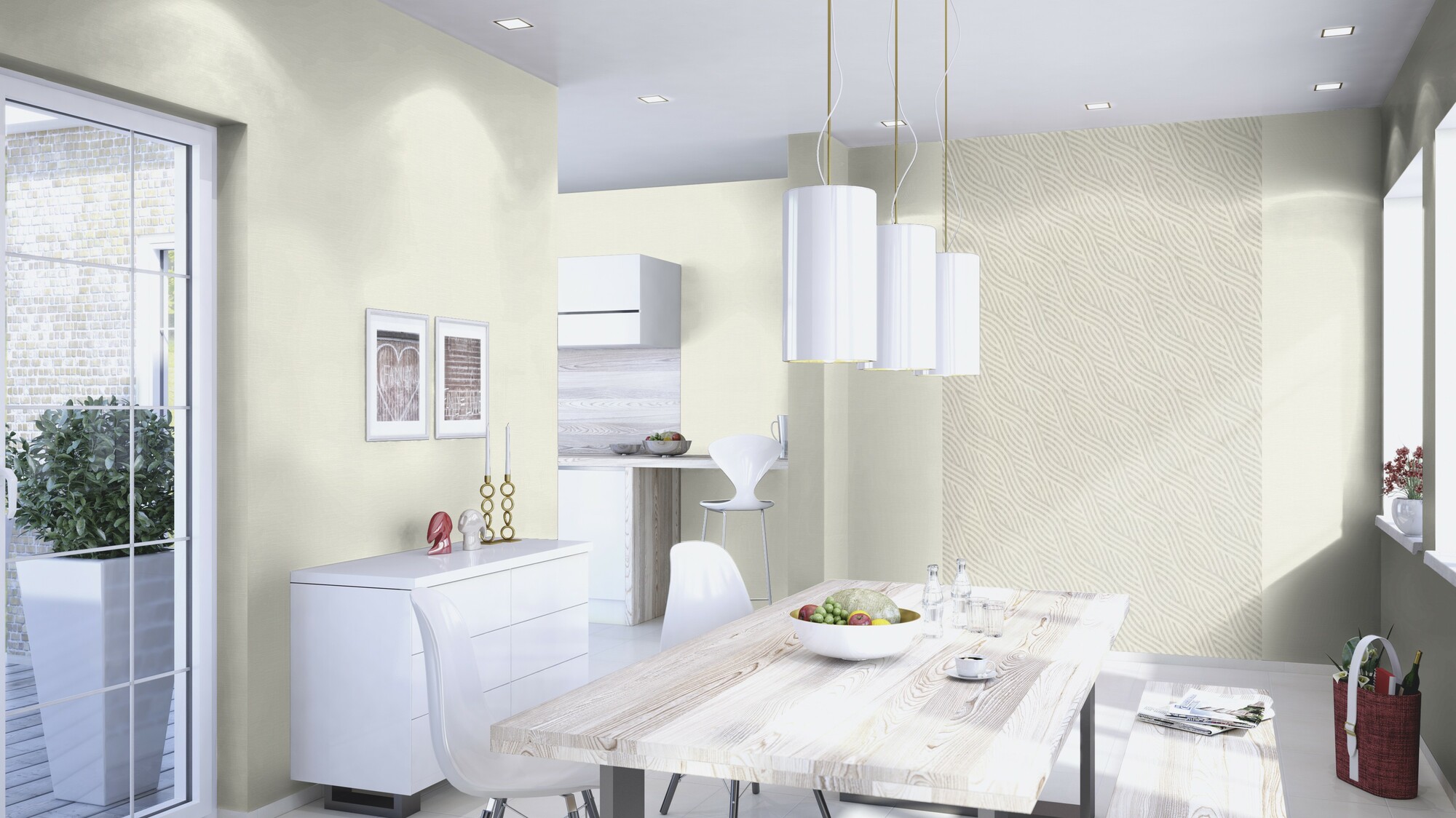Die abstrakten Sandverwehungen verlaufen mal nebeneinander, mal übereinander und bringen anmutige Dynamik und lebendiges Formenspiel in jeden Raum. Auf dem cremeweißen Hintergrund mit textiler Struktur schwingen sich gleichmäßige Linien in einem eleganten Hellgrau in alle Richtungen. Wohlfühlatmosphäre ist somit garantiert.