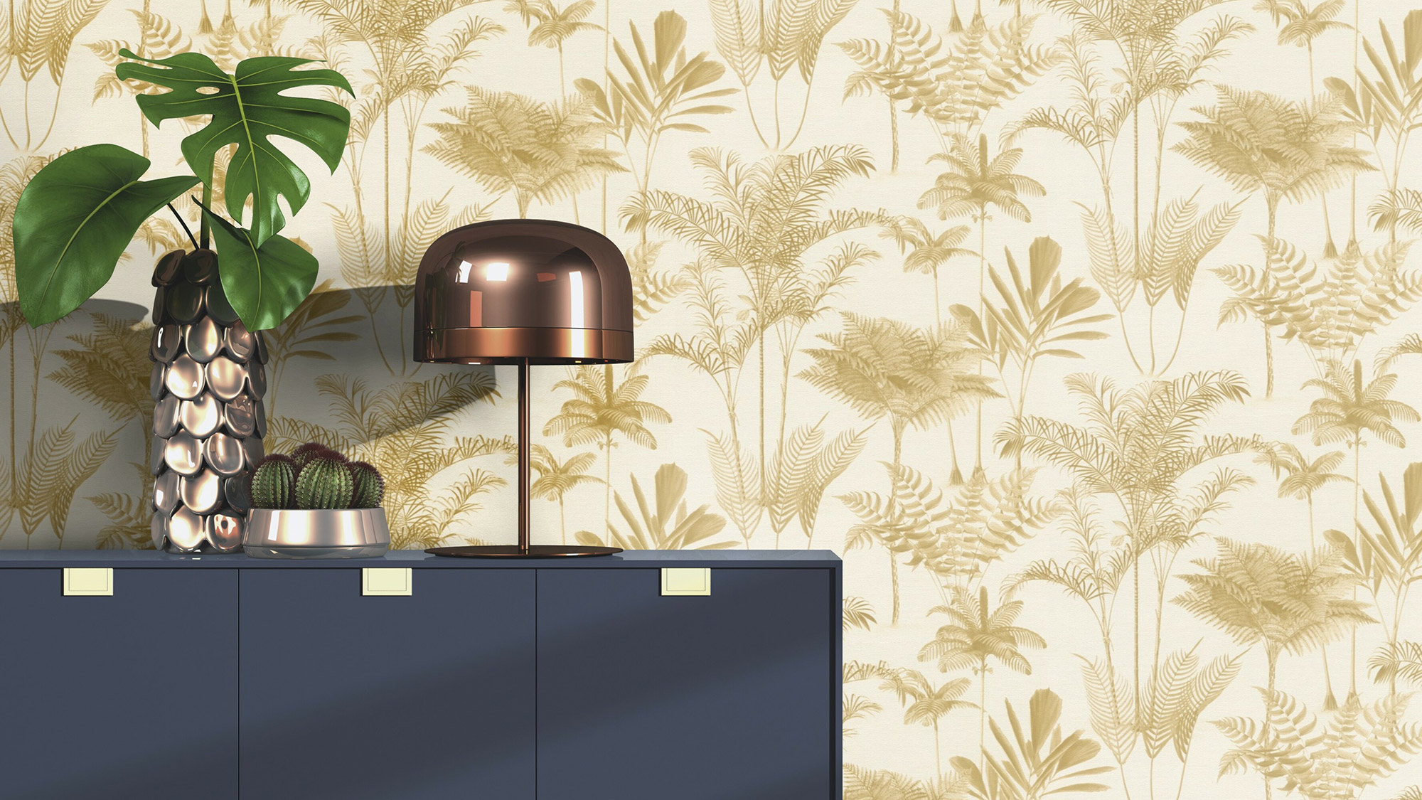 Keine Frage, Urban Jungle ist in aller Munde. Diesen Trend bringen wir jetzt direkt an die Wand und holen mit einem starken, zweifarbigen Pflanzenmotiv natürliches Wohngefühl nach Hause. Die brillanten Zeichnungen von tropischen Palmen und anderen exotischen Gewächsen in frischem Currygelb auf einem cremeweißen Hintergrund mit feiner Struktur lassen uns entspannt aufatmen. Als i-Tüpfelchen ist diese Tapete dank einer neuen Oberfläche ganz einfach und völlig nahtlos zu tapezieren und zugleich sehr strapazierfähig und stoßfest.
