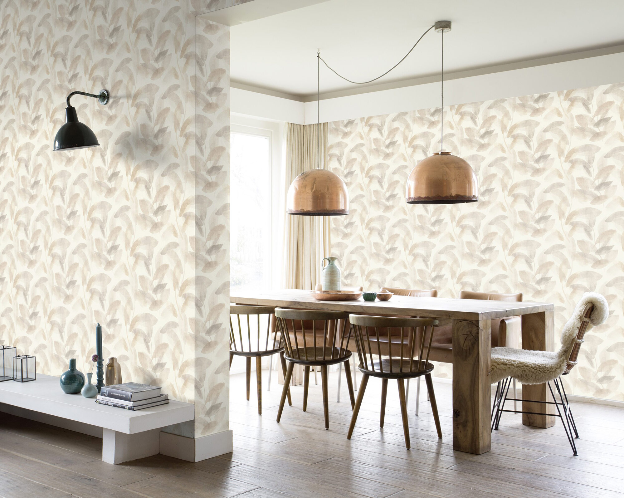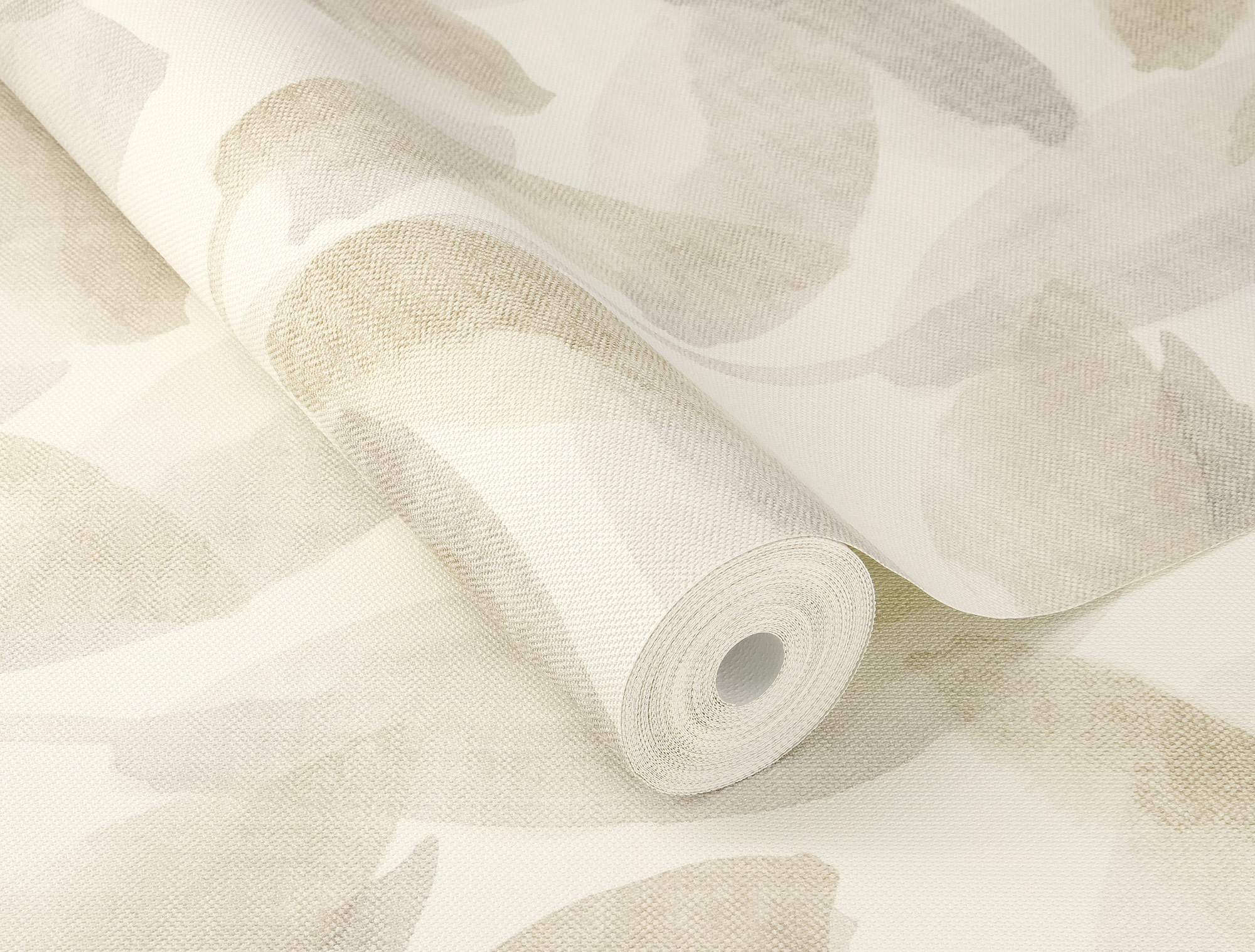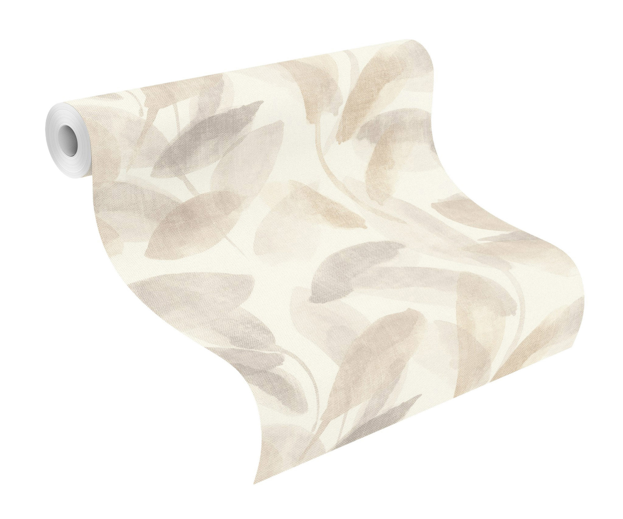 Diese Tapete zeigt ein zartes Muster von Blättern in gedeckten Beige- und Grautönen, die sich in einem aquarellartigen Stil über den Hintergrund verteilen. Die Blätter wirken transparent und leicht verwischt, was der Tapete eine ruhige, fast traumhafte Atmosphäre verleiht. Der helle Hintergrund hebt die sanften Farben hervor und sorgt für eine freundliche, luftige Raumwirkung. Ideal für Räume, die eine dezente, natürliche Eleganz mit einem Hauch von Modernität suchen.