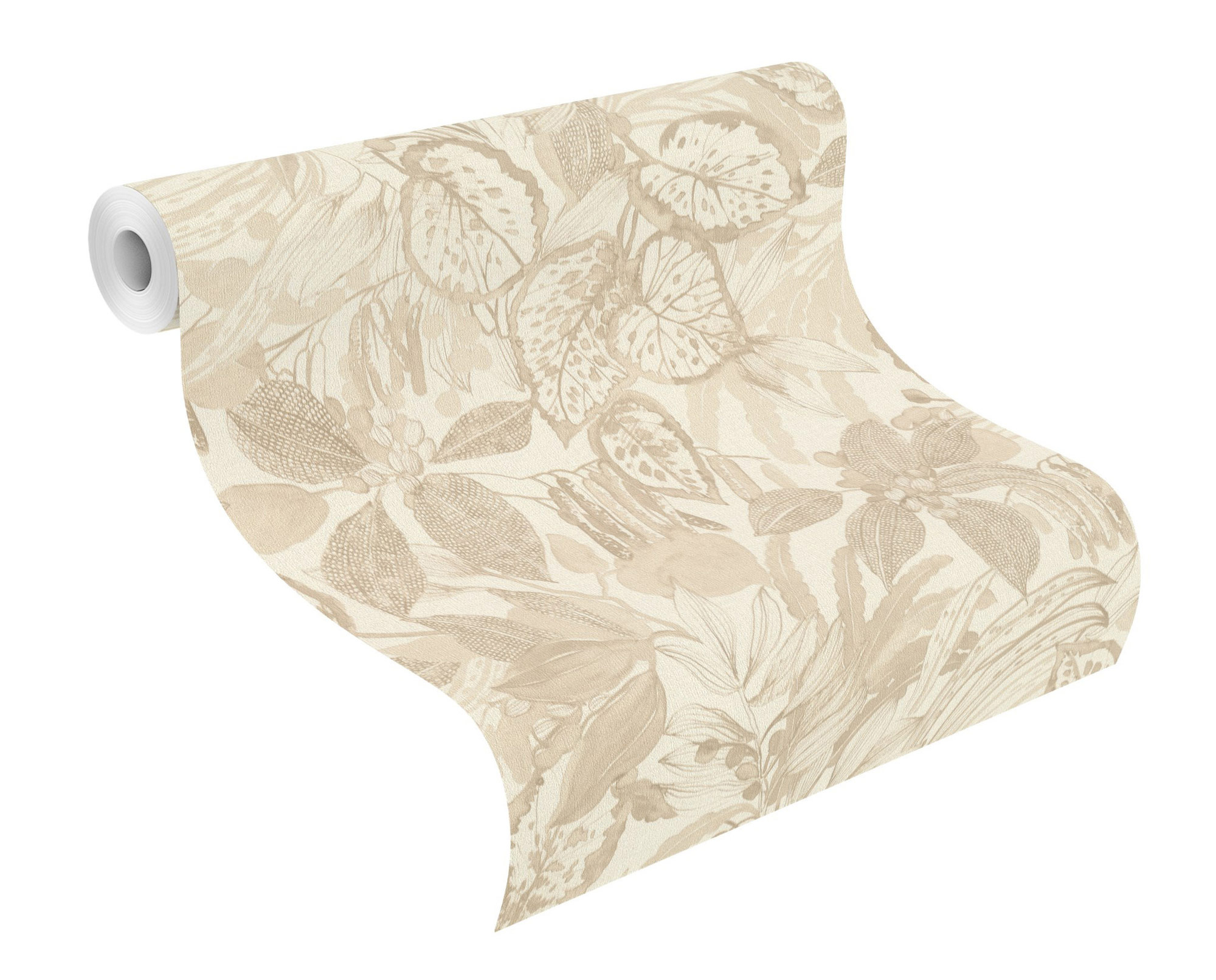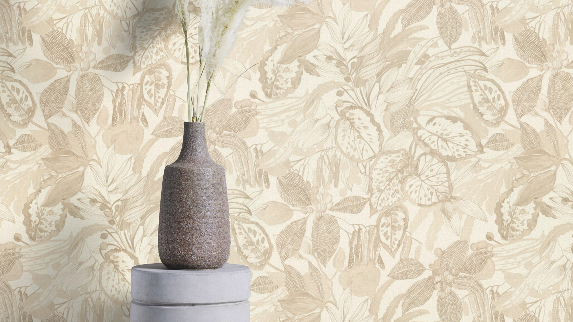 Die Tapete zeigt ein florales Muster mit einer Vielzahl von zarten Pflanzen und Blättern. In sanften, neutralen Beigetönen gehalten, verleihen die detaillierten Blätter und Blumen dem Design eine natürliche und zugleich elegante Ausstrahlung. Die weichen, geschwungenen Linien und die feinen Schattierungen der Pflanzen schaffen eine beruhigende Atmosphäre. Diese Tapete passt sich mühelos verschiedenen Einrichtungsstilen an und ist perfekt geeignet, um ein warmes und einladendes Ambiente in Wohnräumen oder Büros zu schaffen. Ideal für alle, die eine subtile, naturverbundene Wandgestaltung suchen.