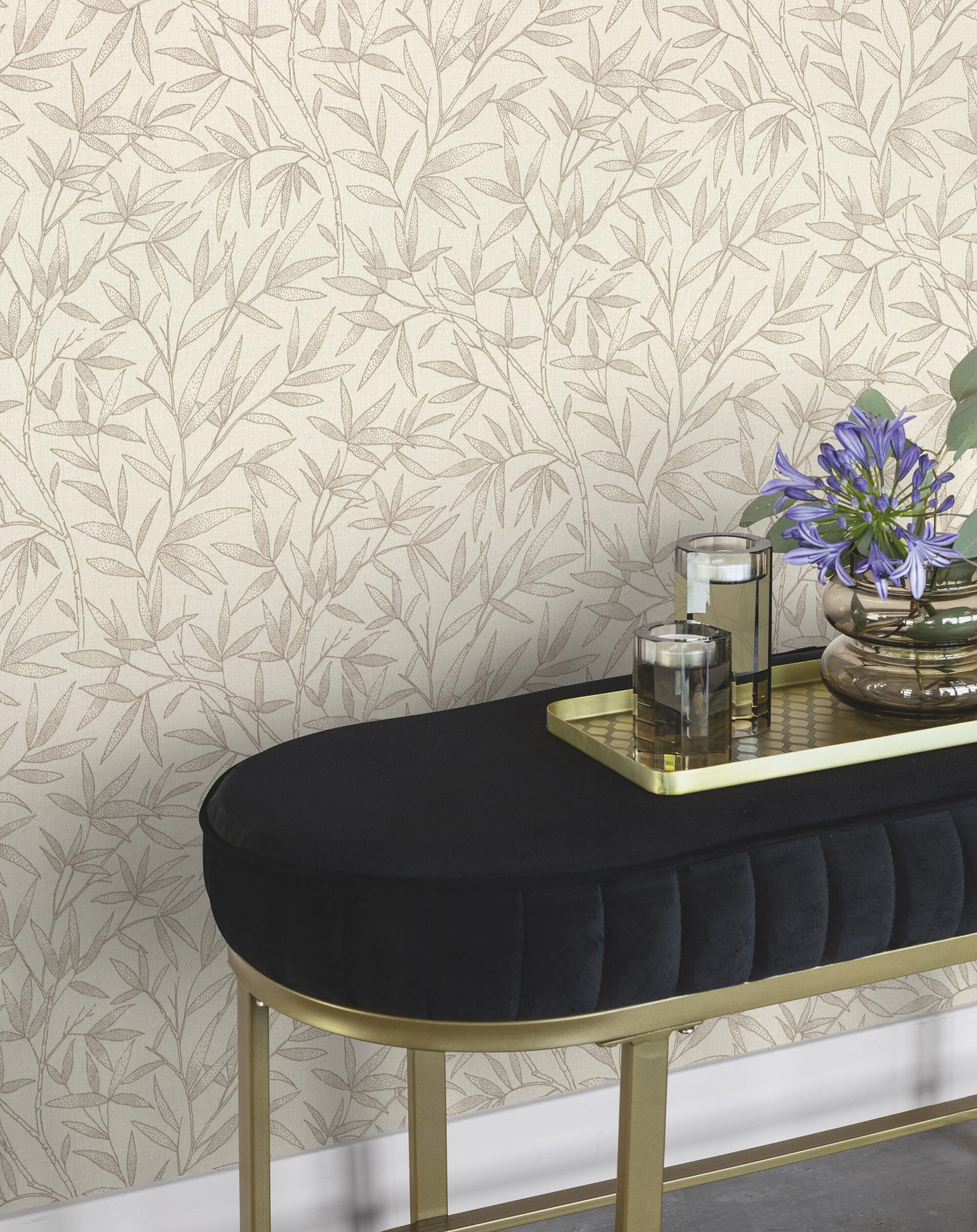 Die Tapete zeigt ein beruhigendes und elegantes Muster von zarten Bambuszweigen, die in einem warmen, sanften Beige-Ton gehalten sind. Die feinen Linien und die filigranen Blätter verleihen der Tapete eine natürliche und leichte Anmutung. Sie eignet sich perfekt für Räume, die eine ruhige Atmosphäre mit einem Hauch von Natürlichkeit benötigen. Der dezente, hellbeige Hintergrund harmoniert perfekt mit den filigranen Zweigen und sorgt für ein stilvolles und modernes Raumgefühl. Ideal für Wohnzimmer, Schlafzimmer oder Eingangsbereiche, die mit einem eleganten, aber unaufdringlichen Design verschönert werden sollen.