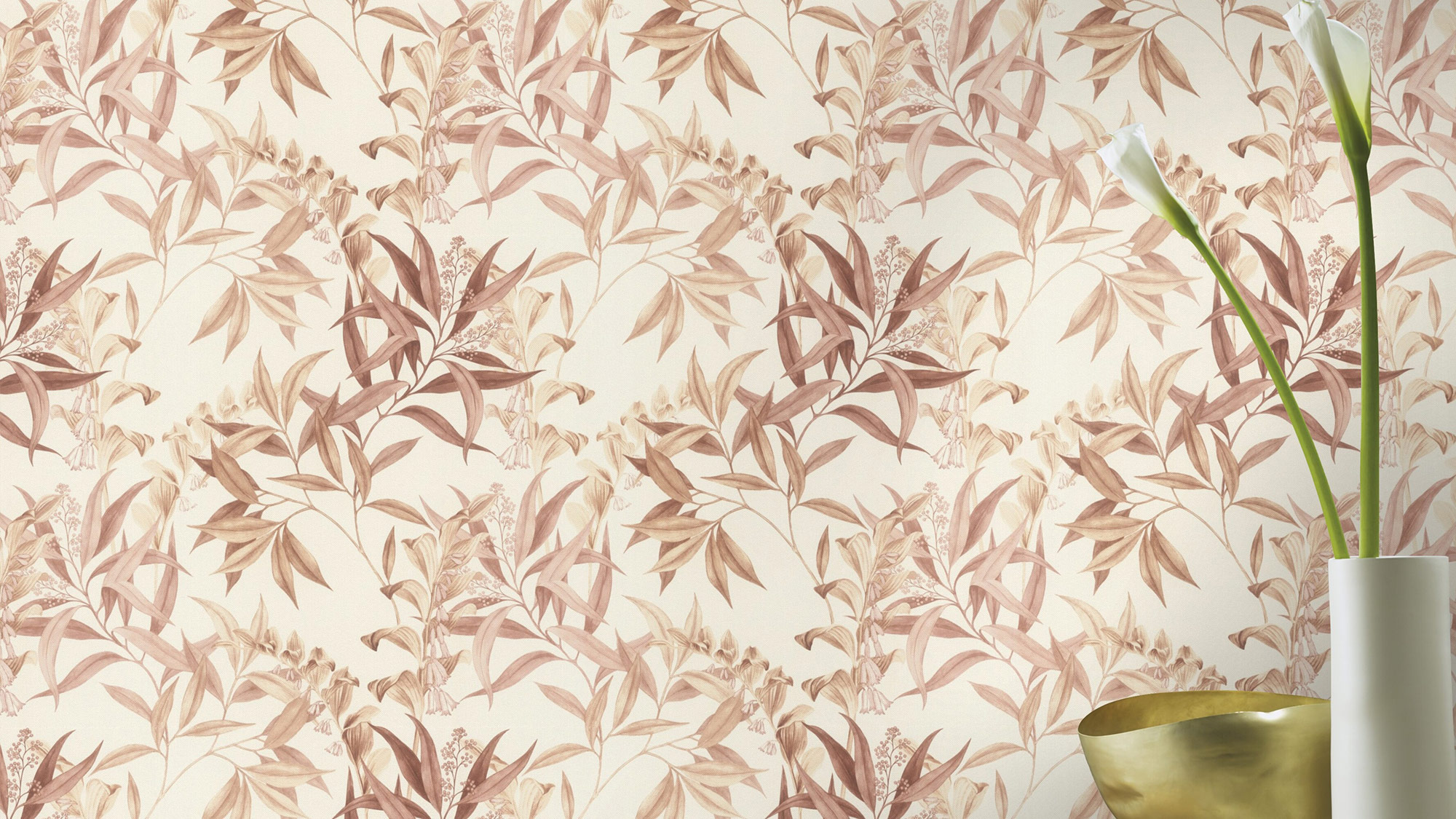 Diese Tapete zeigt ein zartes florales Muster mit eleganten Blättern und glockenförmigen Blüten. Die Zeichnung ist in sanften Beige- und Rosétönen gehalten, die dem Design eine warme, harmonische Ausstrahlung verleihen. Die fein ausgearbeiteten Pflanzenmotive erinnern an botanische Illustrationen und sorgen für eine ruhige, natürliche Atmosphäre im Raum. Der helle Hintergrund unterstreicht die Leichtigkeit des Musters und macht die Tapete ideal für Wohn- und Schlafräume, die eine sanfte, stilvolle Gestaltung erhalten sollen.