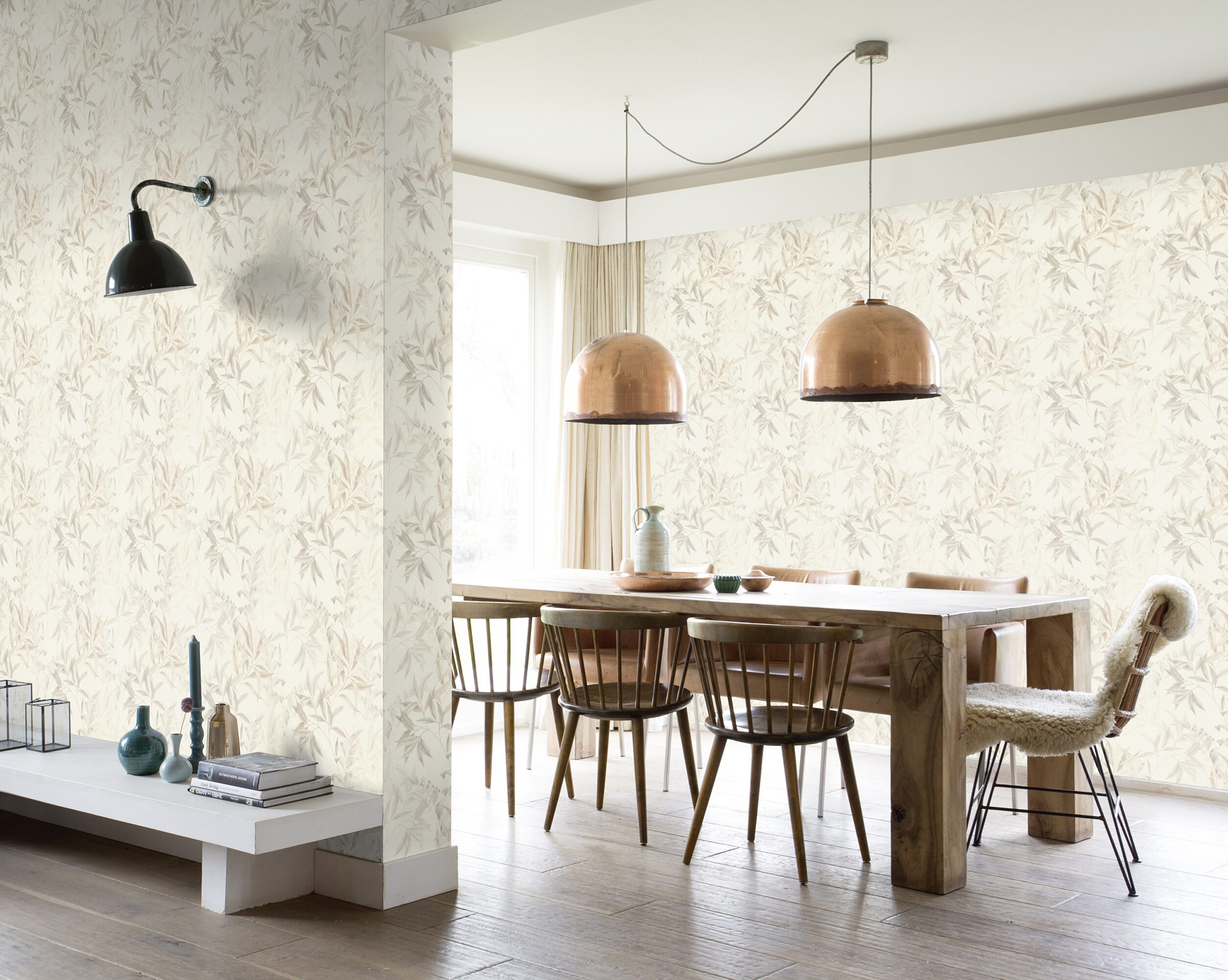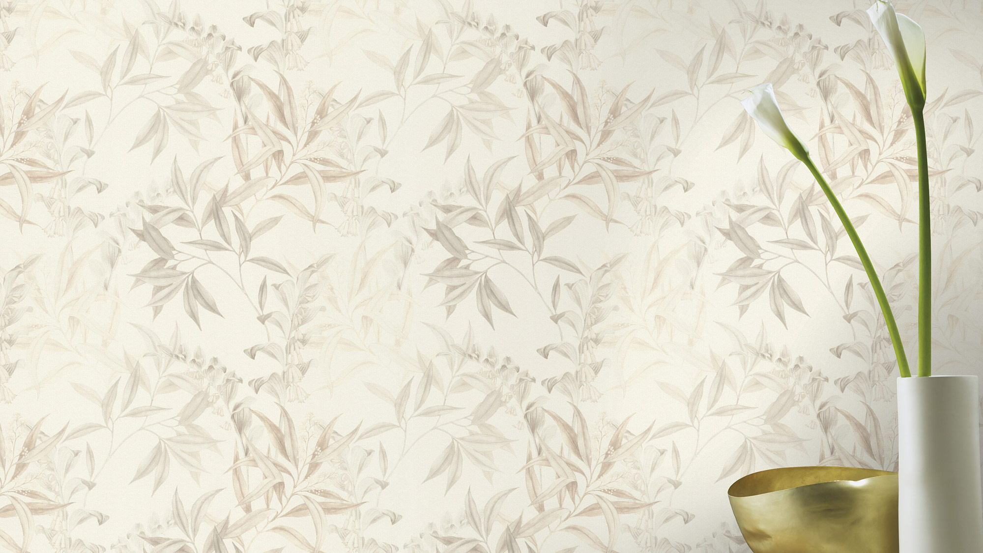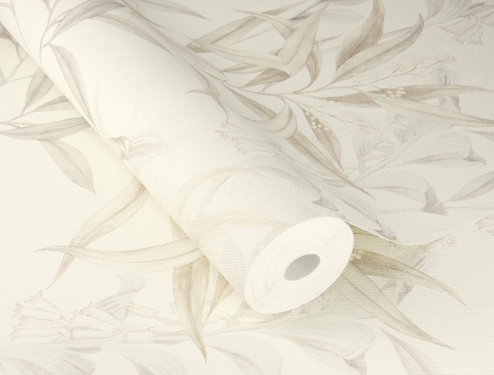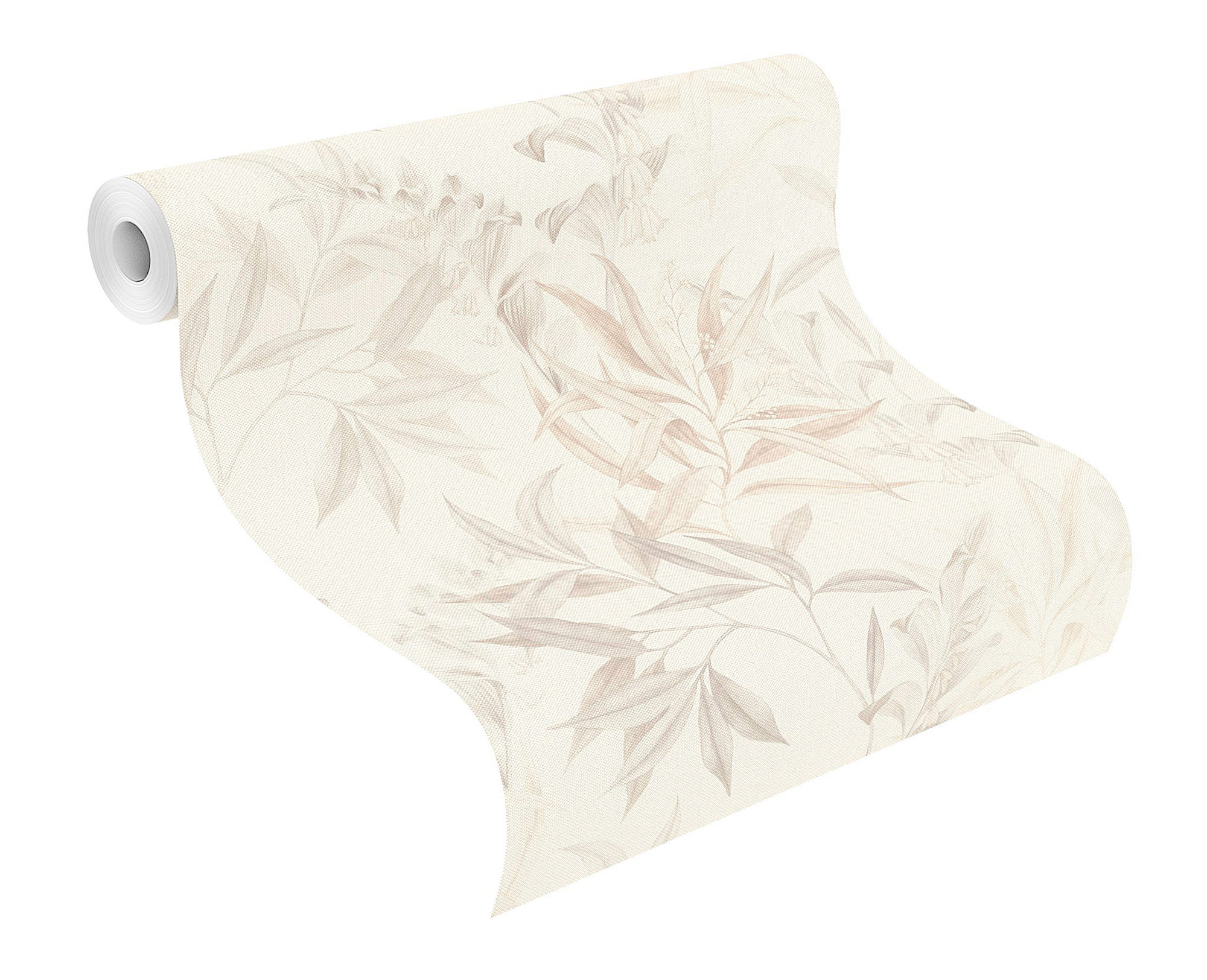 Diese Tapete zeigt ein filigranes florales Muster in dezenten Naturtönen. Feine Blätter und zarte Blüten ranken sich über einen hellen, cremefarbenen Hintergrund und erzeugen eine leichte, luftige Atmosphäre. Die Farbgebung ist in zurückhaltenden Beige- und Grautönen gehalten, wodurch das Design elegant und zeitlos wirkt. Die detailreiche Gestaltung erinnert an klassische botanische Illustrationen und verleiht dem Raum eine natürliche, ruhige Ausstrahlung ideal für Wohn-, Schlaf- oder Arbeitsbereiche, in denen eine harmonische Raumwirkung gewünscht ist.
