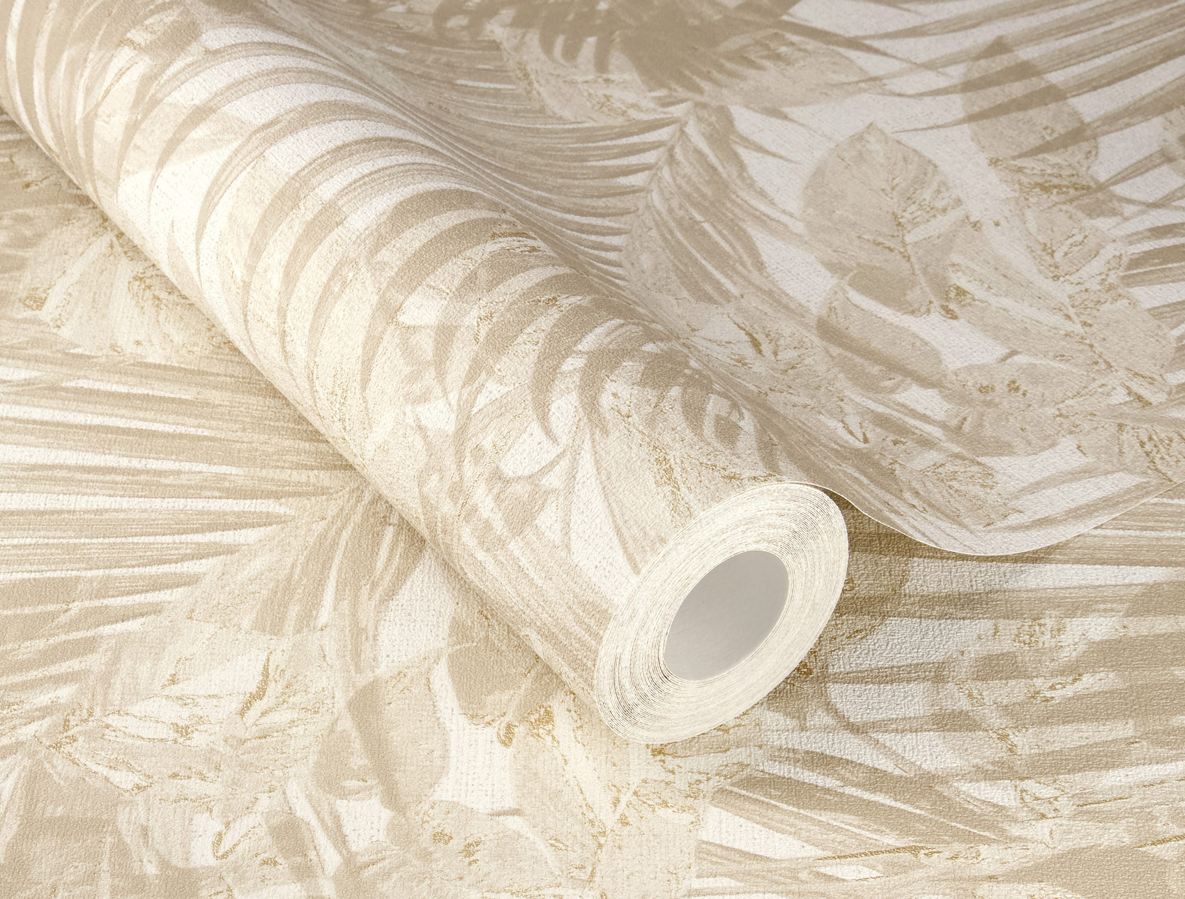 Schön entspannt ? genauso mögen wir es Zuhause. Das Palmenmotiv TROPICAL hat zum Glück an alles gedacht, damit wir dieses Gefühl jeden Tag genießen können: Sanfte Farben wie Sand und helles braun, ein üppiger Pflanzenprint mit zarten Gold-Effekten und im Hintergrund eine natürliche Gewebe-Struktur. Das Tapetendesign kann für sich alleine stehen oder schönen Wohnaccessoires eine tolle Bühne bieten.