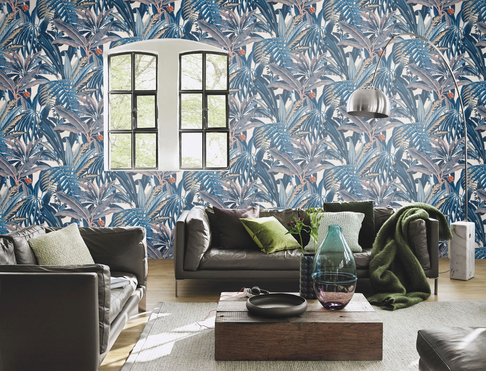 Exotische Blattmotive dürfen ab sofort auch an den Wänden wuchern. Mit viel Stilbewusstsein präsentiert sich auf dieser Motivtapete ein dichtes Blattwerk auf dem weißen Hintergrund. Harmonisch wirkt das Zusammenspiel aus unterschiedlichen Blau- und Grautönen, das mit etwas Beige und Rotbraun aufgelockert wird.