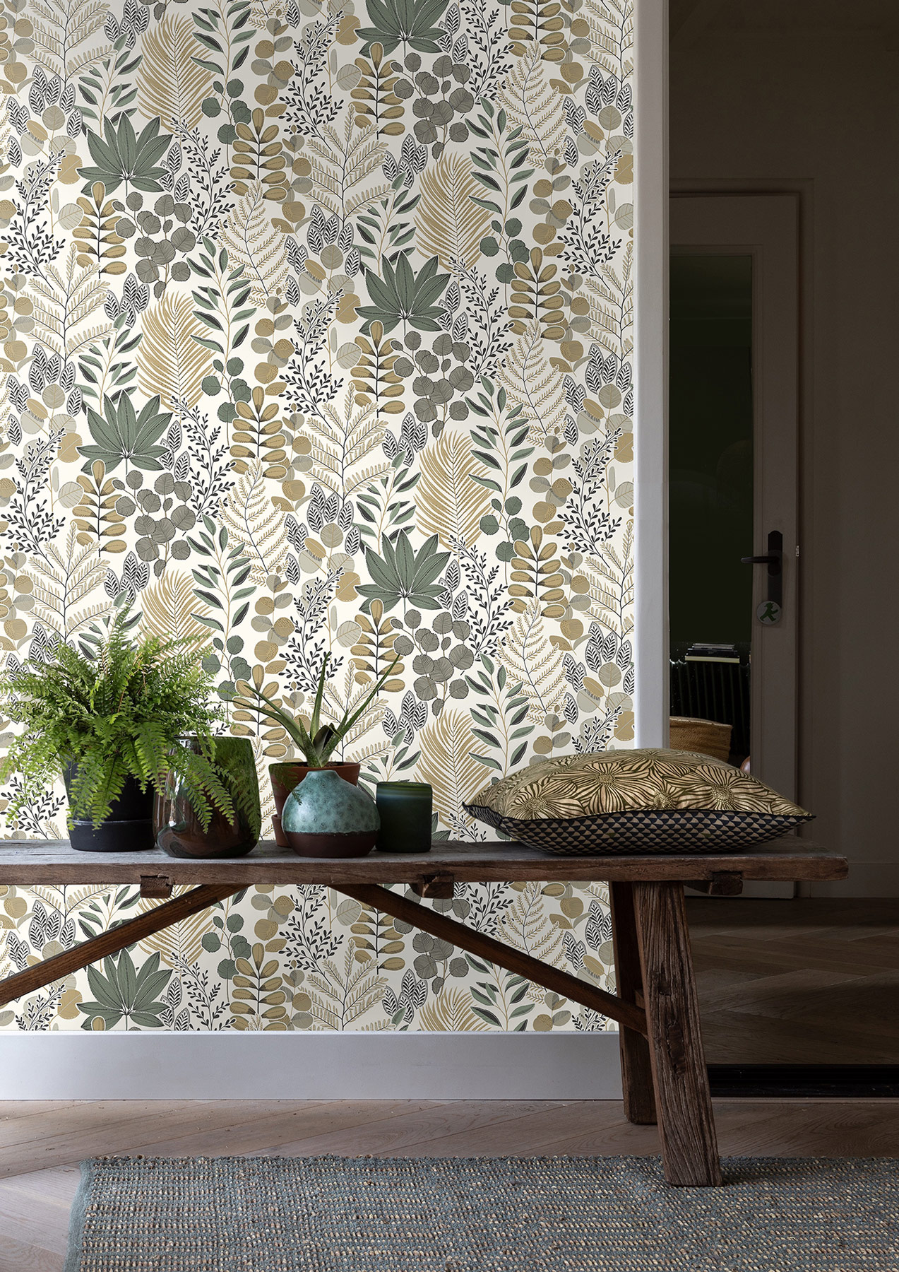 In Puncto Wandgestaltung hat sich das Blatt gewendet. Verschiedenste Blätter in warmen Farbtönen von Grün und Braun bilden eine stillvolle und lebendige Collage an der Wand. Der weiße Hintergrund mit der edlen Textilstruktur bildet den passenden Rahmen.