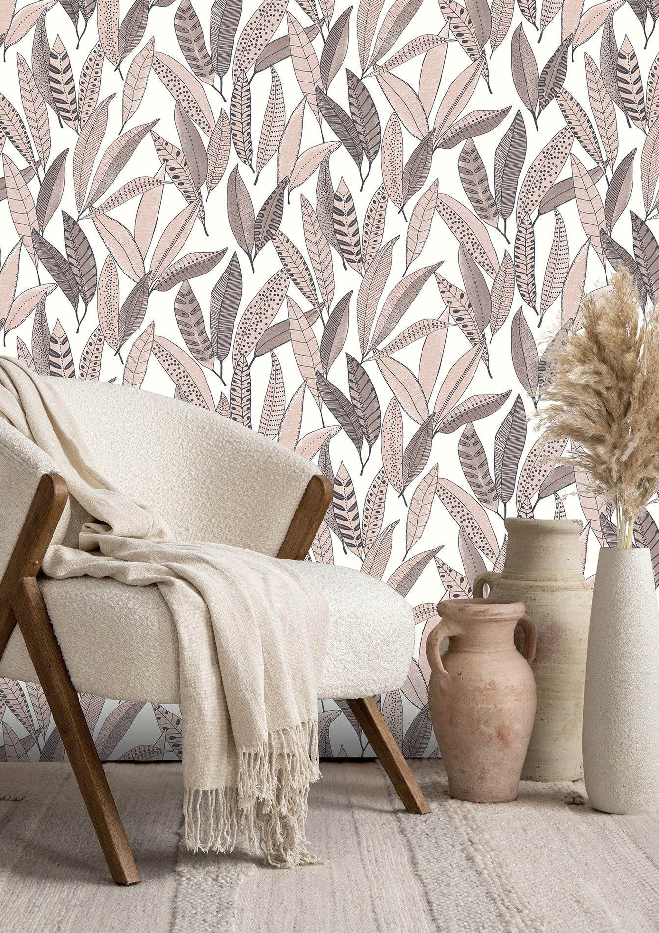 Ein bezauberndes Blättersammelsurium kommt auf dem weißen Hintergrund mit feiner Struktur daher. Die länglichen Blätter mit unterschiedlichen Mustern präsentieren sich in einem fantastischen Arrangement. Mit einer fabelhaften Farbkombination von Rosa, Taupe und Schwarz entsteht eine einzigartige Wanddekoration, die jeden Raum mit Wohlfühlatmosphäre füllt.