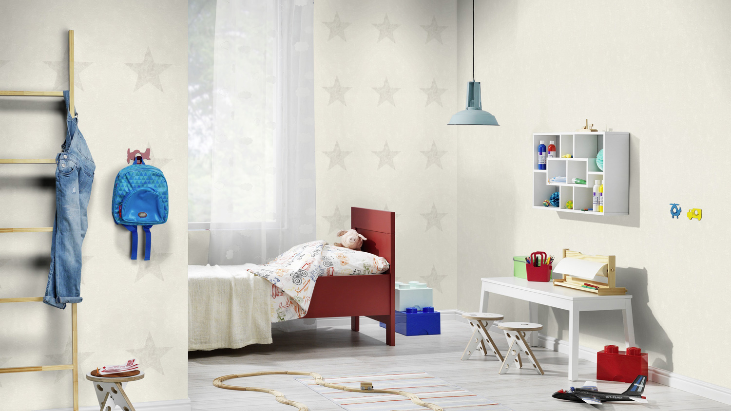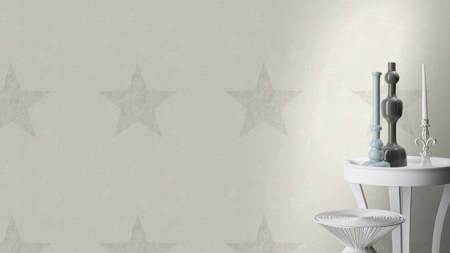 Keep it simple, lautet das Motto dieser Tapete: Eine schöne, lebendig und natürlich wirkende Struktur im Hintergrund, davor ein einfaches, grafisches Element, dass jedoch ein echter Hingucker ist, ein großer Stern. Da dieser in seinem hellen, warmen Grau nur ein wenig dunkler als die Hintergrundfarbe ist, wirkt er wie aufgestempelt - und sehr charmant.