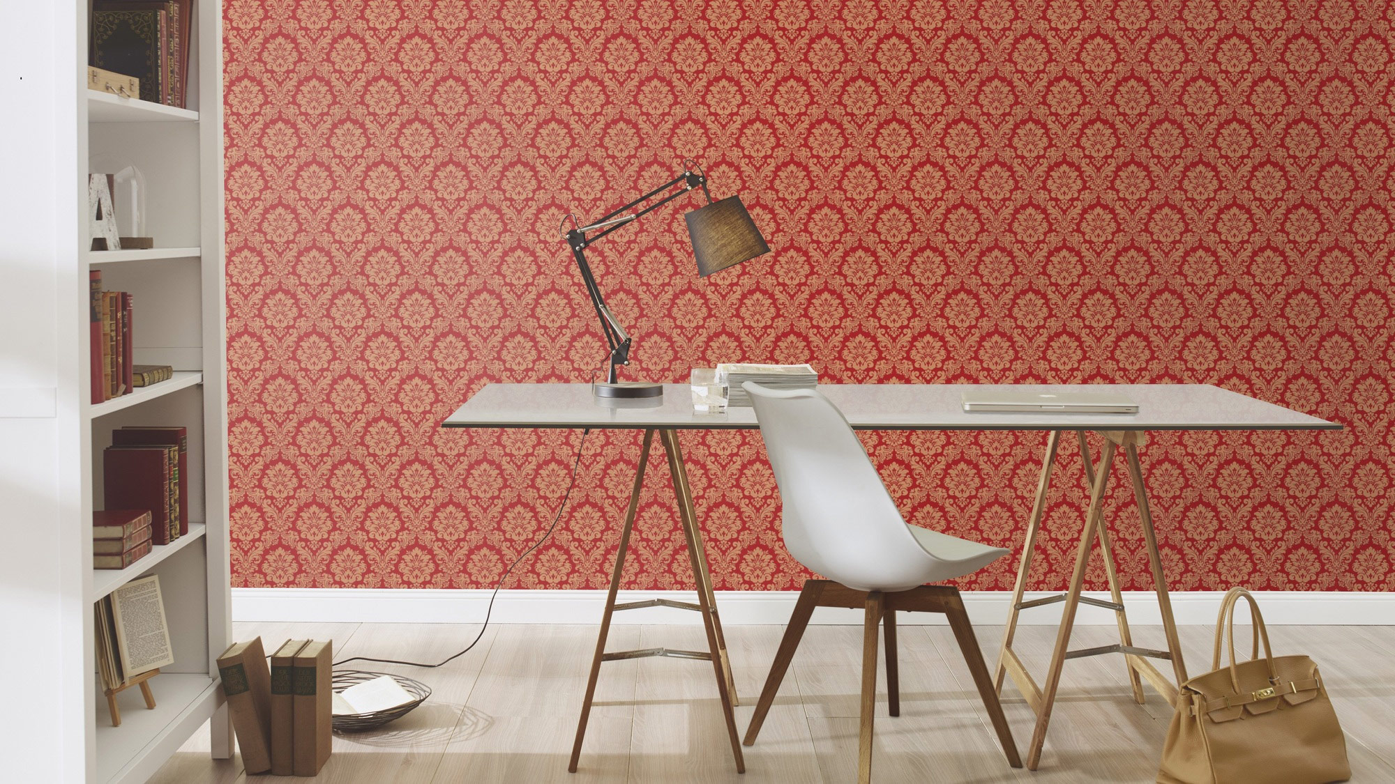 Wie majestätisch: In Taupe und Kaminrot verbreiten die seidigen Ornamente royalen Charme an Wohn- und Schlafzimmerwänden. Ein klassisch-barockes Muster, das nie aus der Mode zu kommen scheint. So anmutig, detailverliebt und wohnlich ist dieses Design auf jedem Parkett Zuhause.